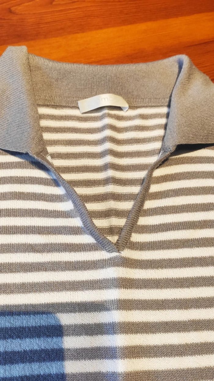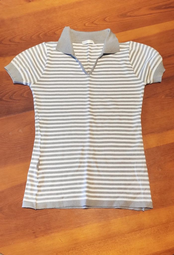 Joli pull à rayures blanc et gris, col en V à manches courtes. Chic et élégant, très peu porté