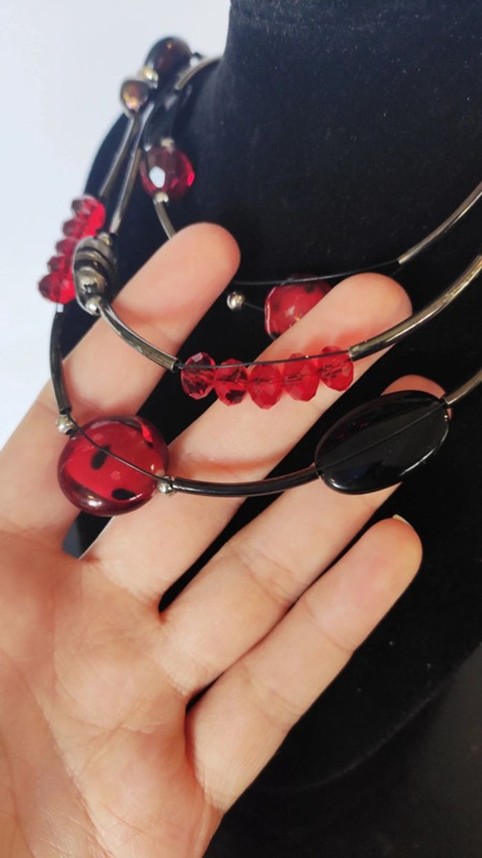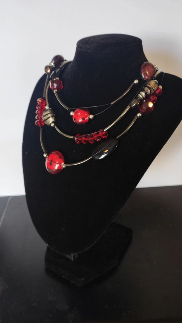 Joli collier noir et rouge à 3 rangées Original, féminin et raffiné Vintage