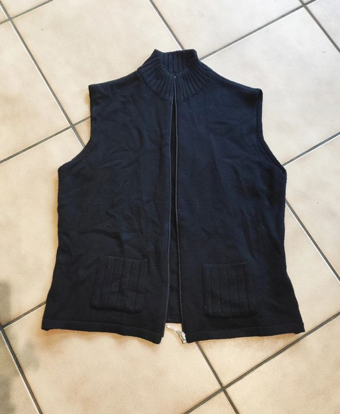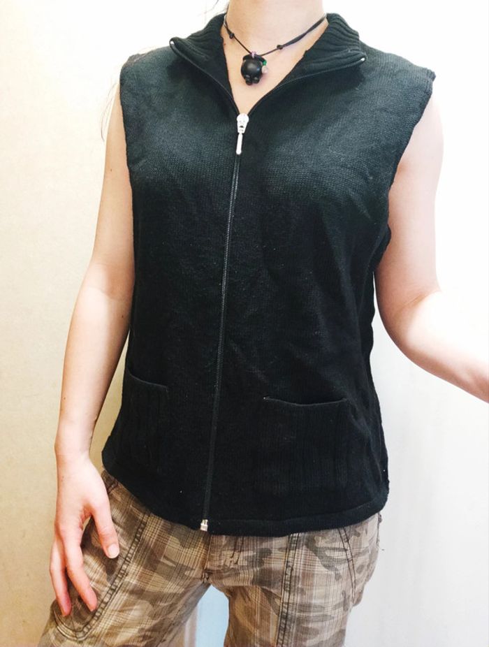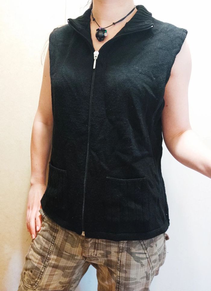 Blouson mixte avec fermeture éclaire et sans manches. Petites poches sur le devant. 50% laine de mérinos, 50% acrylique.