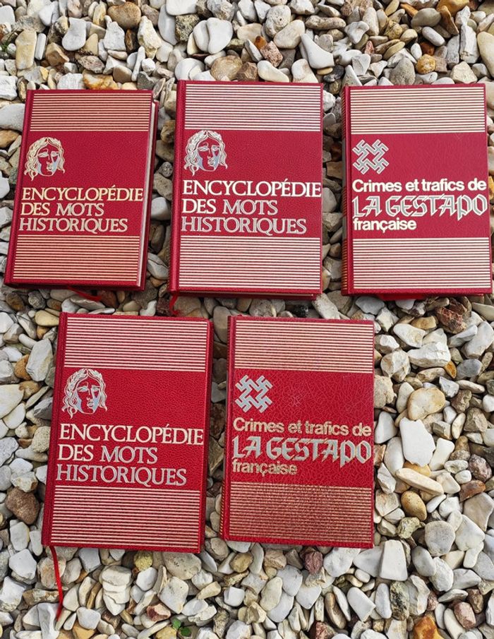 Trois livres : –l'encyclopédie des mots historiques. (Tome 1-2-3) Deux livres: –Les crimes Et trafics de la Gestapo française (tome 1-2) 25€ l'ensemble