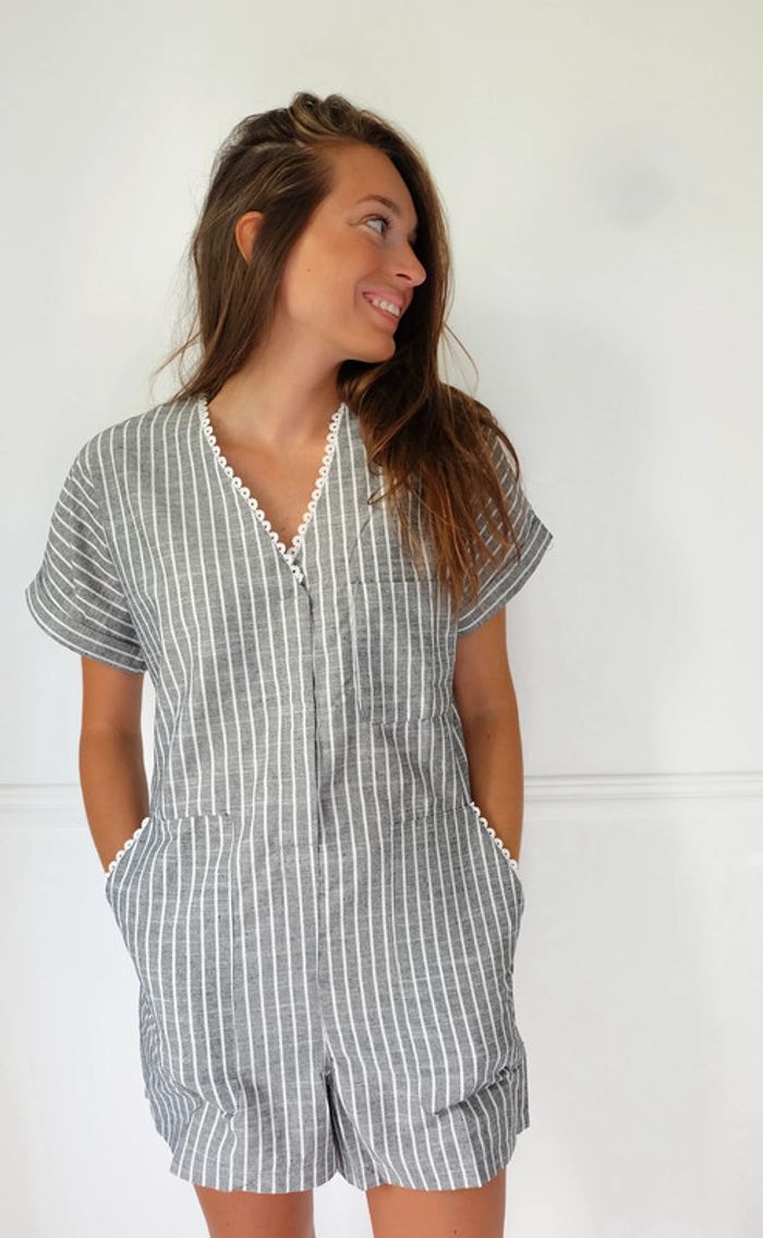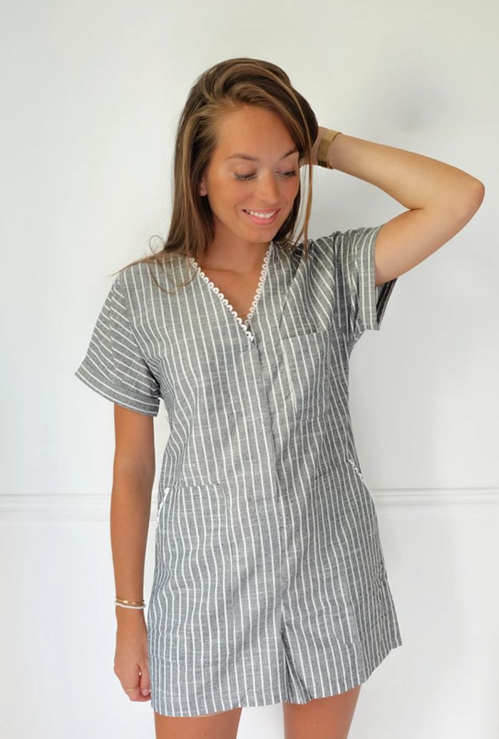 🌟 Combinaison short à rayures gris foncé et blanc avec broderie blanche
