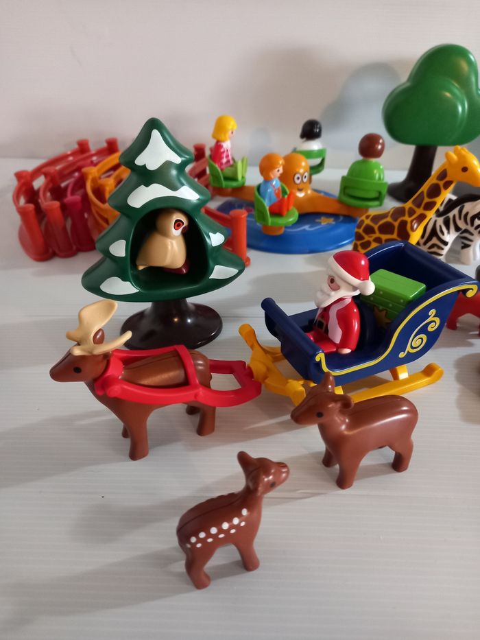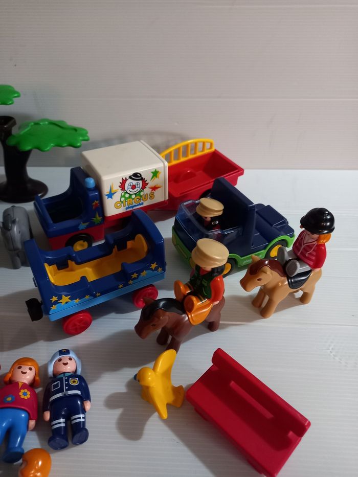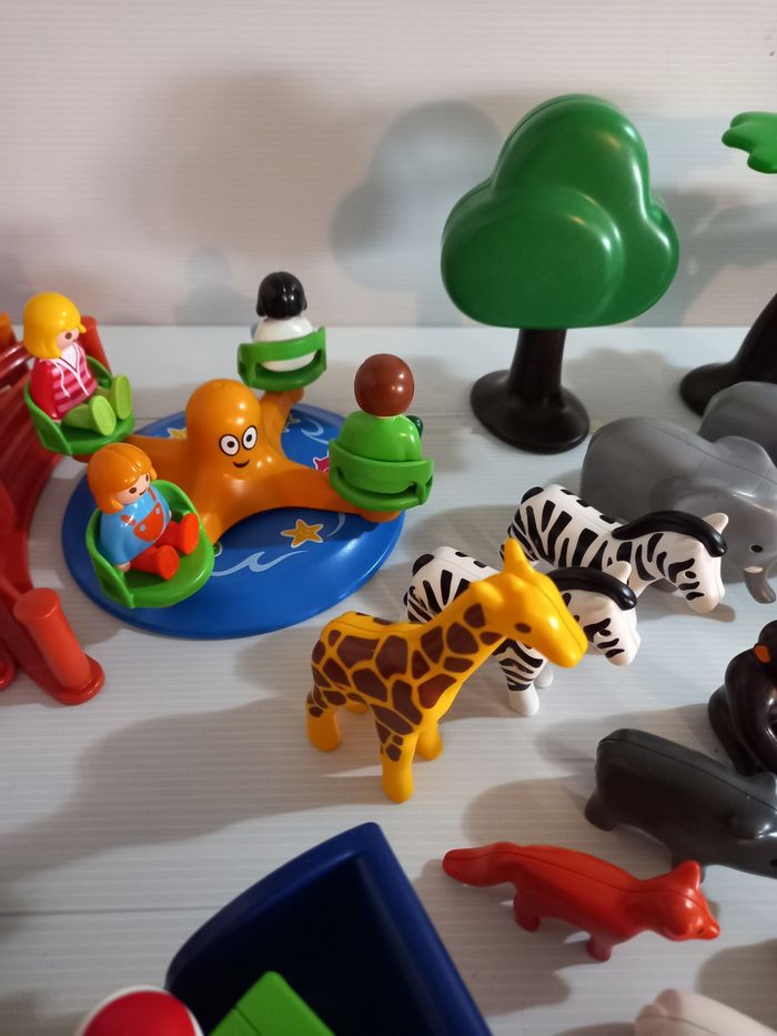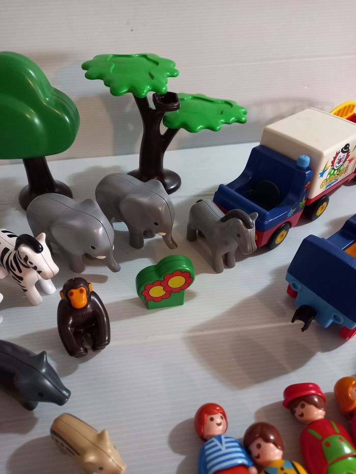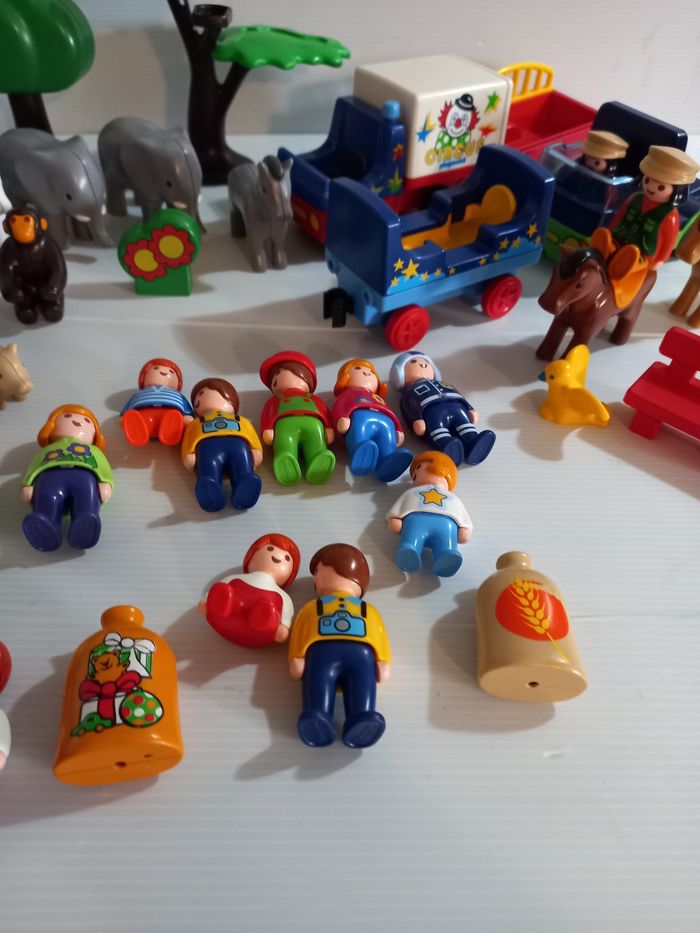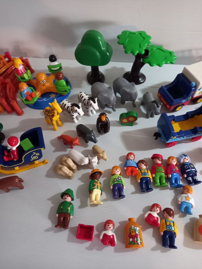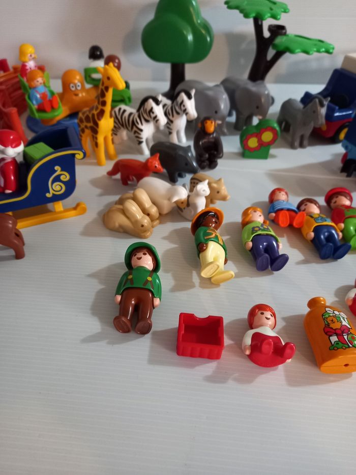 Lot composé de plusieurs série de playmobil 1.2.3. Les lots ne sont pas complets. 21 animaux 20 personnages 8 barrières, quelques accessoires et véhicules. Retour possible sous 14jours lot entier.