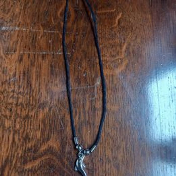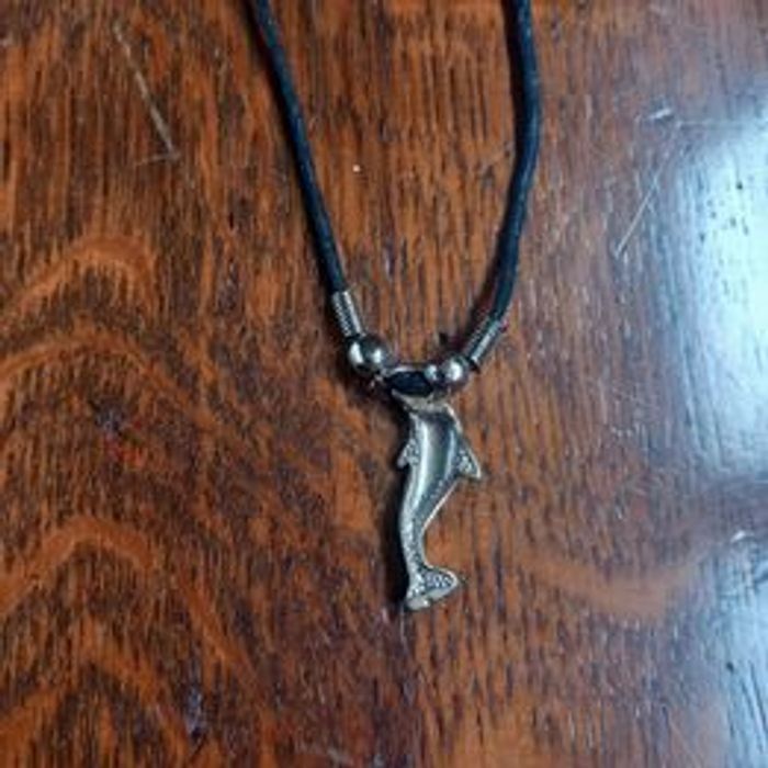 Collier avec pendentif femme Matières métal et cordon Forme dauphin Couleurs argenté et noir En très bon état Dimensions approximative : collier détaché 43cm de long : pendentif 4cm de long et 1cm de large