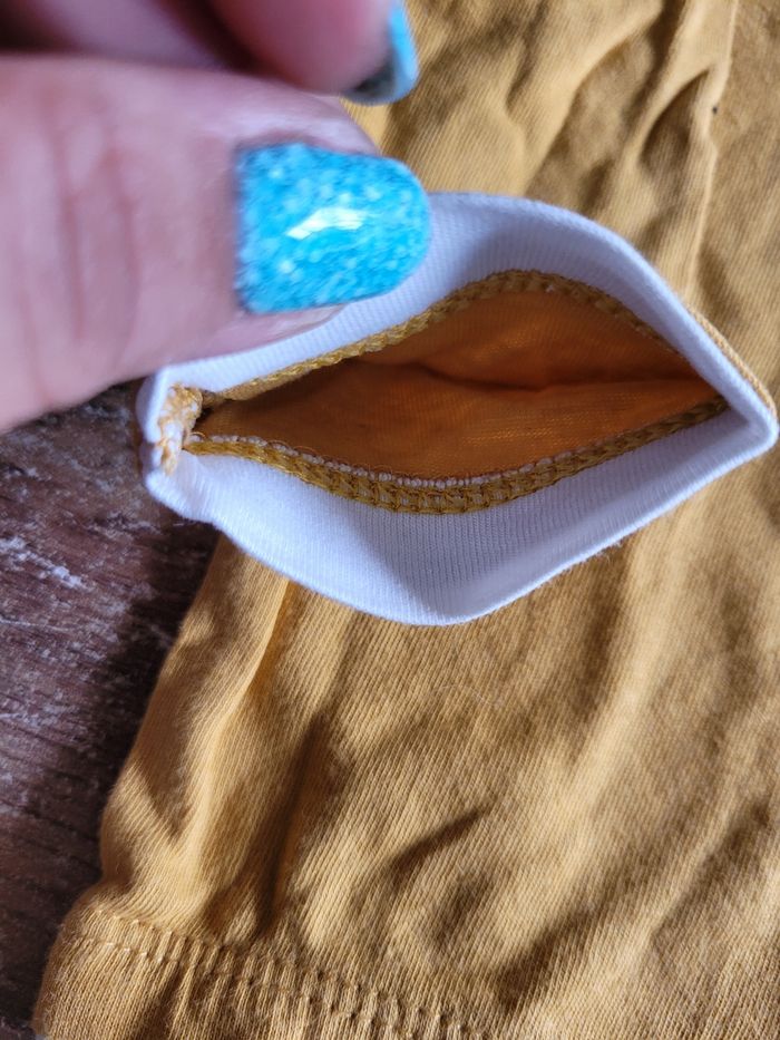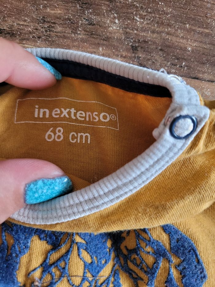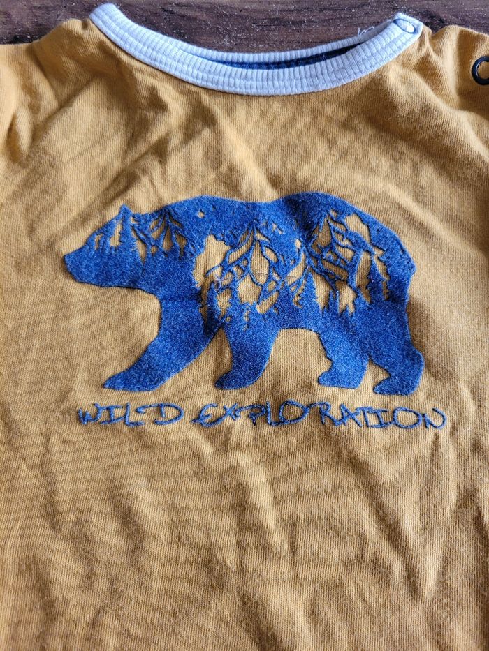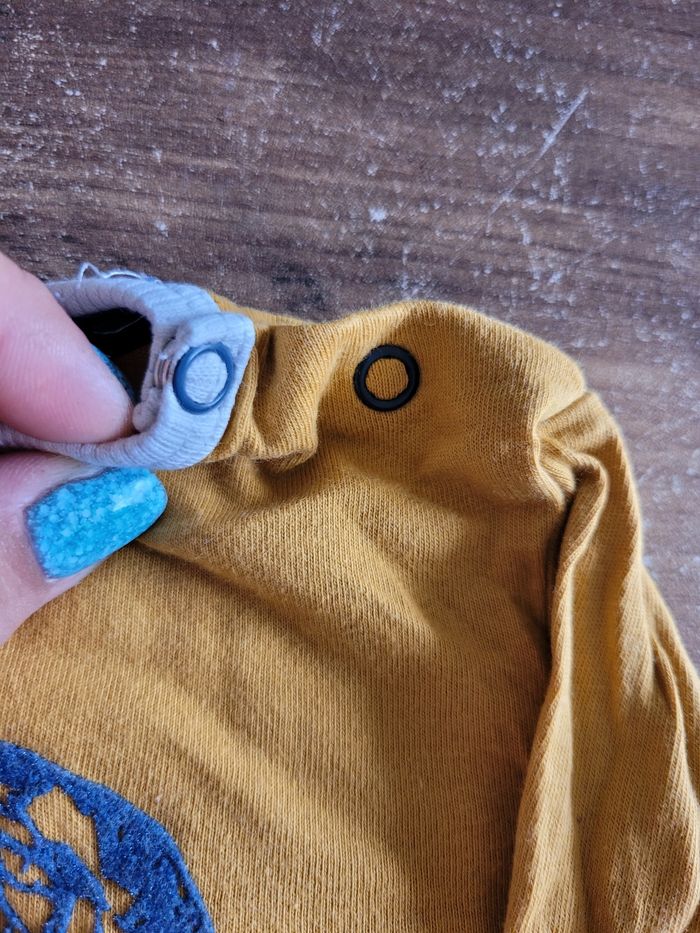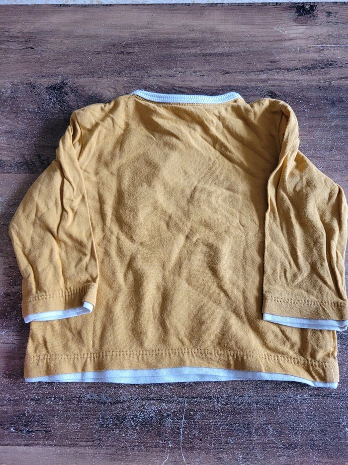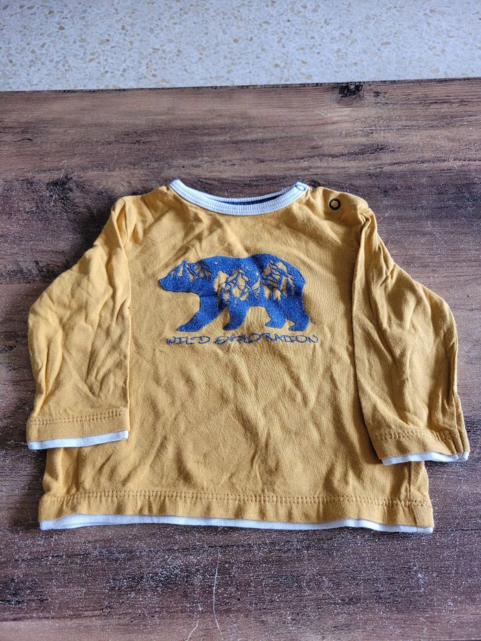 Petit T-shirt Manche longue Couleur moutarde Taille 9 mois Dessin our bleu Attaché en haut a gauche Mi saison