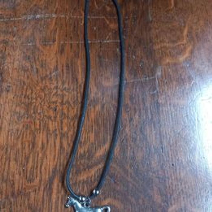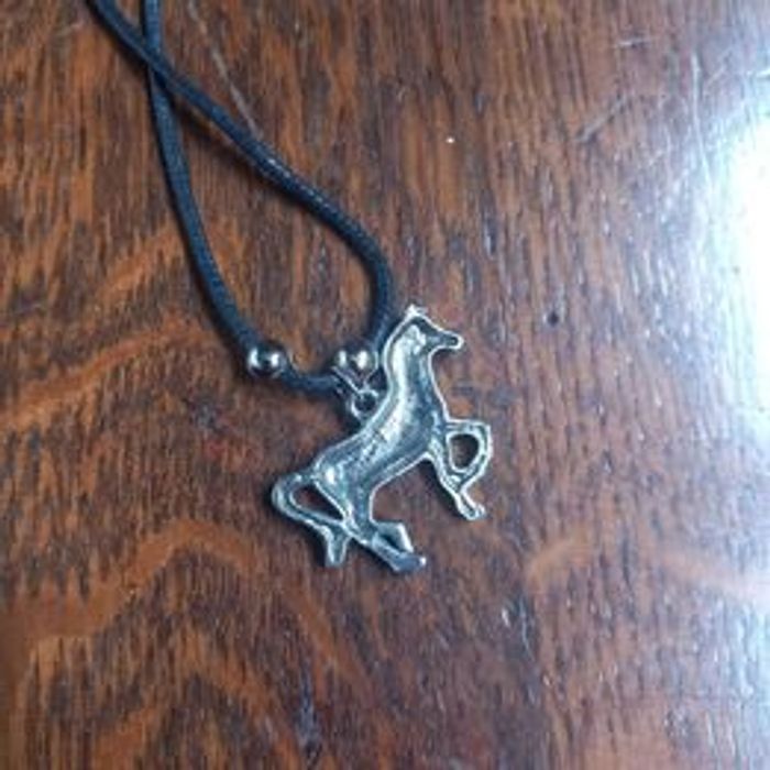 Collier avec pendentif femme Matières métal et cordon Forme cheval Couleurs argenté et noir En très bon état Dimensions approximative : collier détaché 45cm de long : pendentif 3cm de long et 3,5cm de large