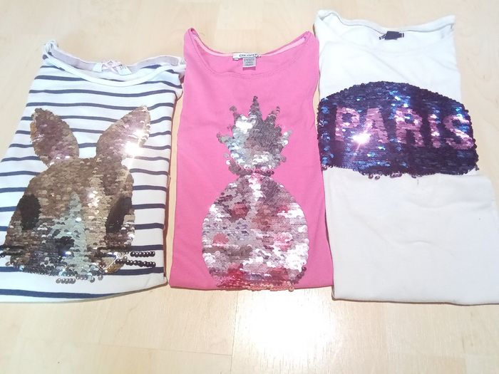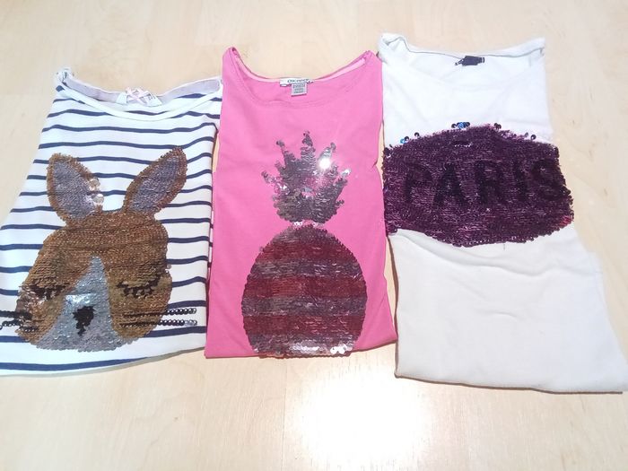 Lot de trois t-shirts réversibles à strass. Un t-shirt marinière manche longue avec un lapin un autre t-shirt manches courtes avec une ananas et un autre t-shirt manches courtes avec une bulle Paris