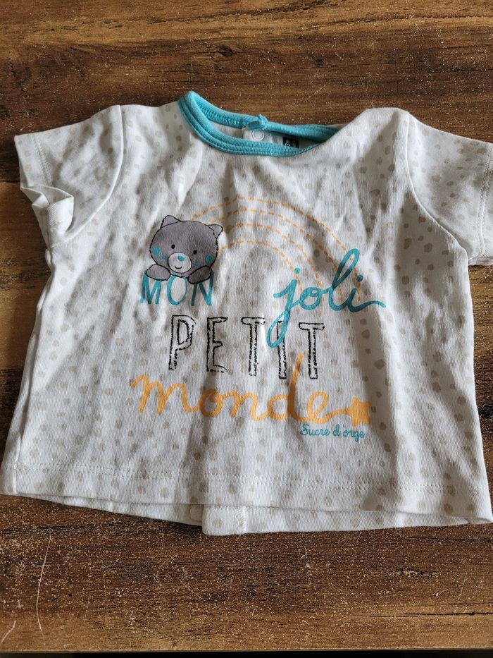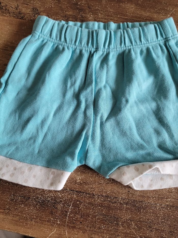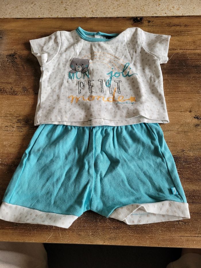 Petit ensemble T-shirt short Short Couleur bleu Taille 3 mois T-shirt Couleur blanc gris et bleu Dessin ours Taille 3 mois Mi saison T-shirt Attaché dans le dos