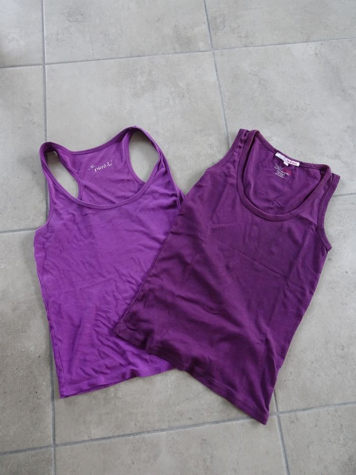 Lot de 2 débardeurs en coton, basique et uni, violet, pimkie et tally weijl, taille M, très bon état.