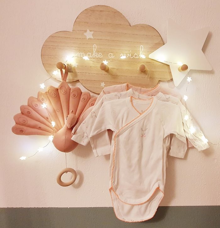 Trois bodies cadet rousselle avec petits lapins, taille 3 mois, très peu portes.