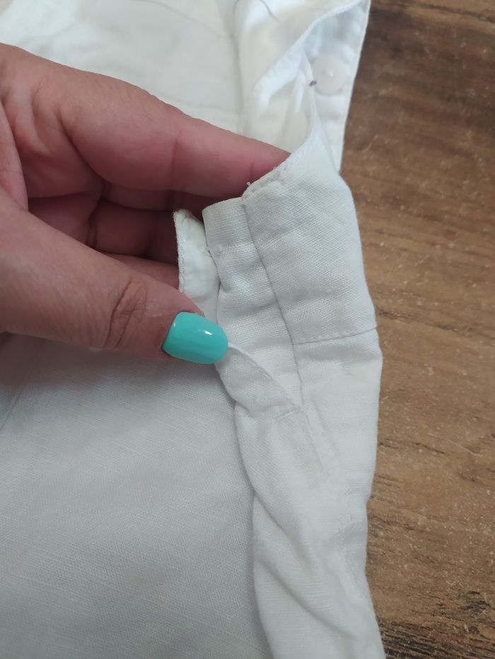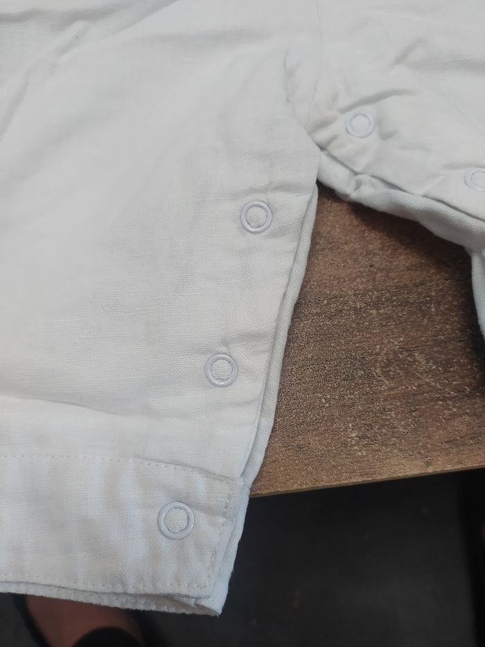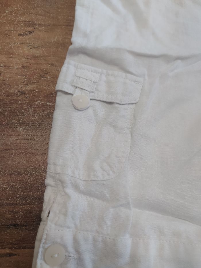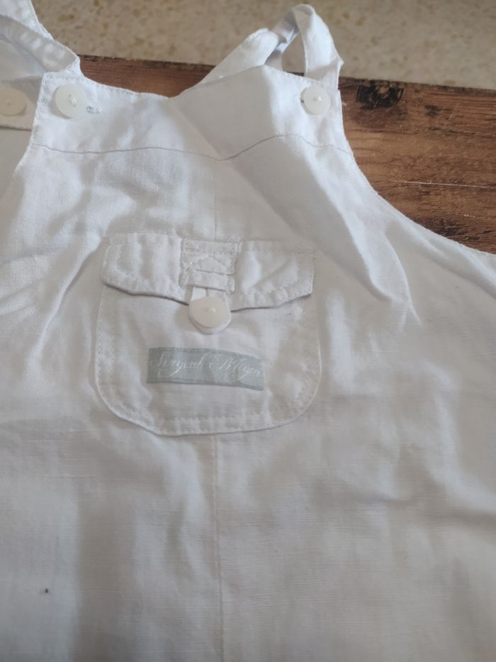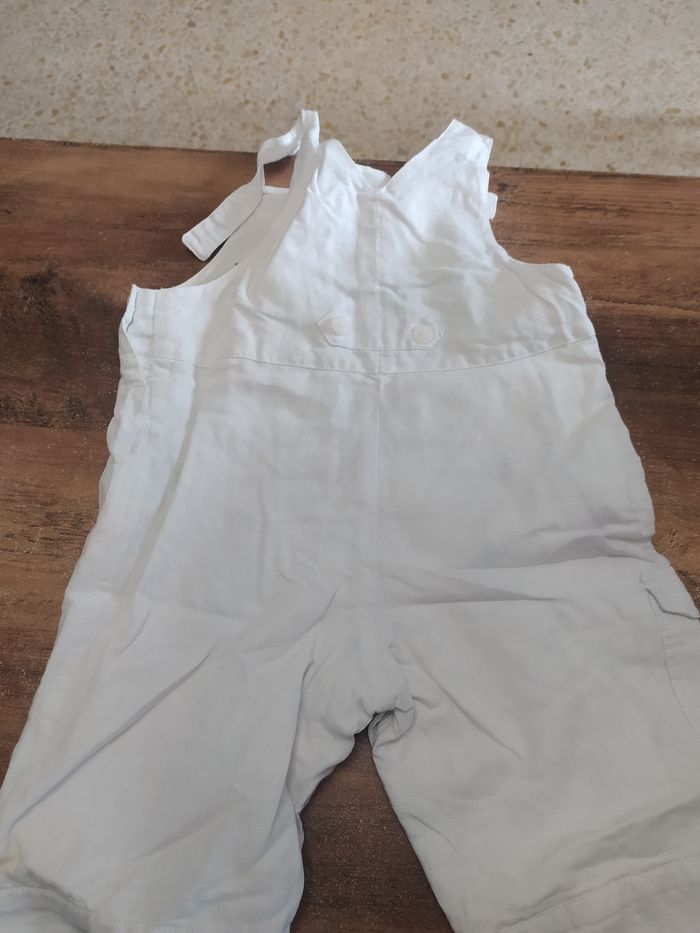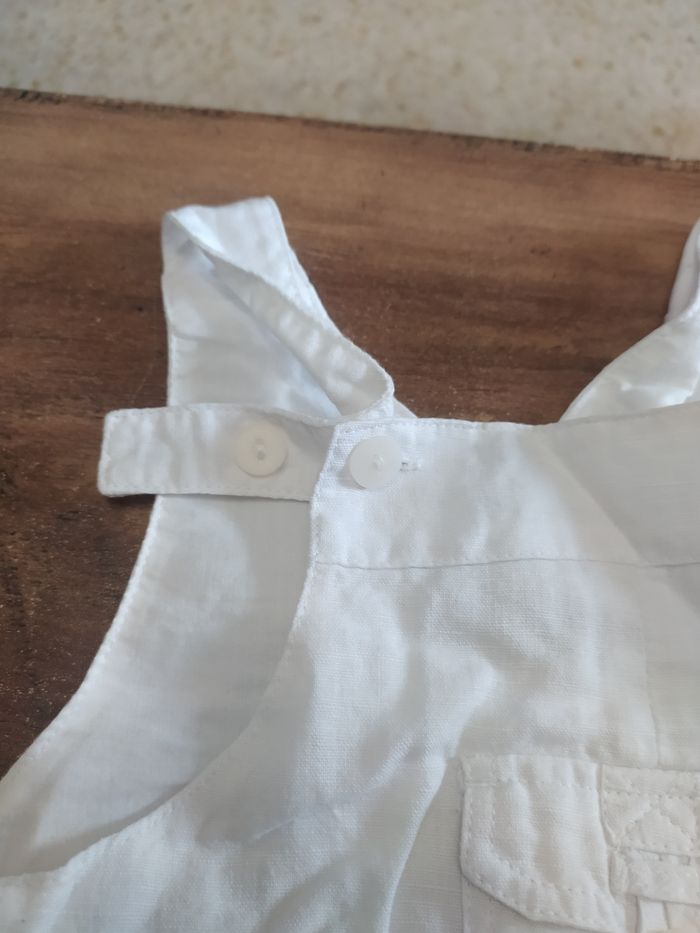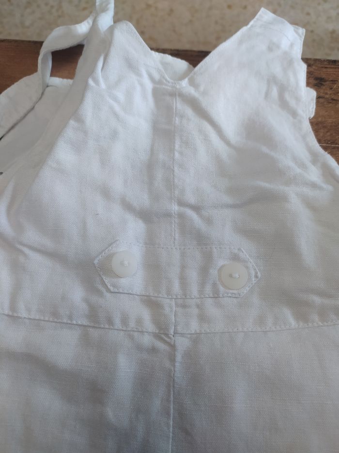 Petite salopette blanche Elle s'ouvre en bas avec des petits boutons Une petite poche sur le côté gauche et une petite poche devant