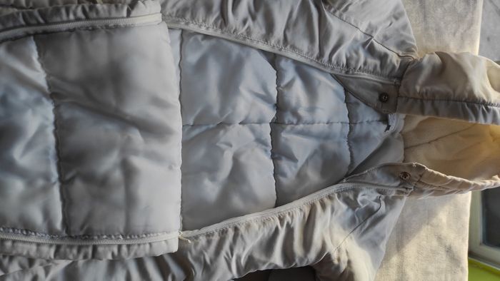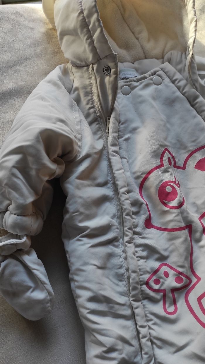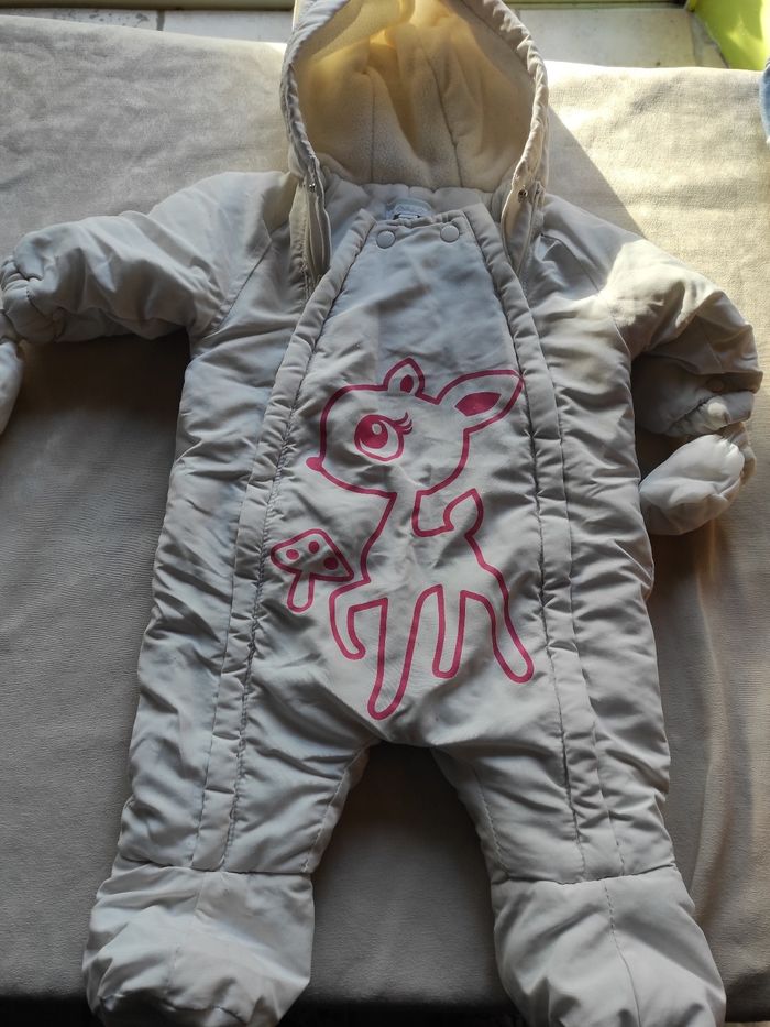 Jolie combinaison bien chaude avec motif faon. Fermeture éclair de chaque côté plus boutons pressions au col. Petits moufles accrochés. Reste en très bon état malgré quelques bouloches.