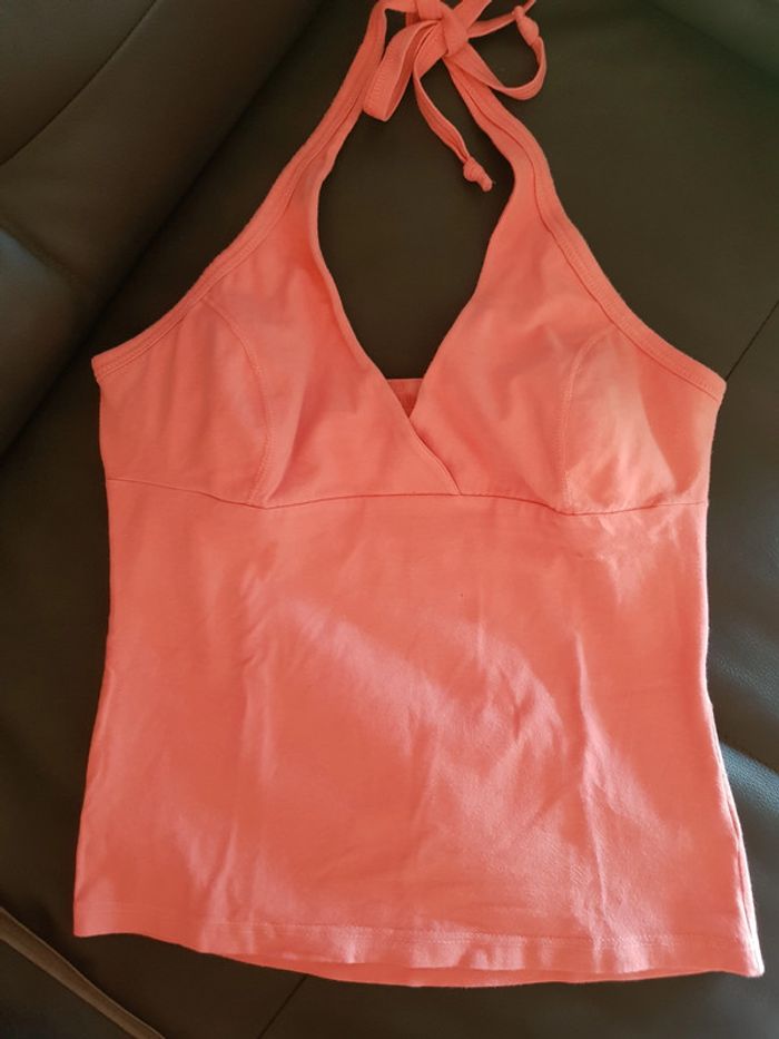 Débardeur tour de cou, dos nu excellent état Avec bandeau élastique de maintien pour la poitrine Porté 3 fois seulement (j'exècre les bandeaux, j'ai voulu retenter mais sans succès ! 😅) Coloris corail Taille 38 #top#corail38 #tourdecou #debardeur38