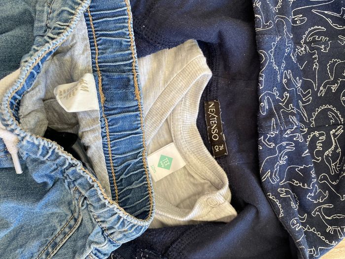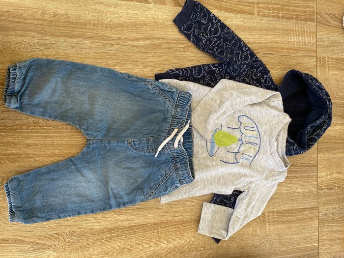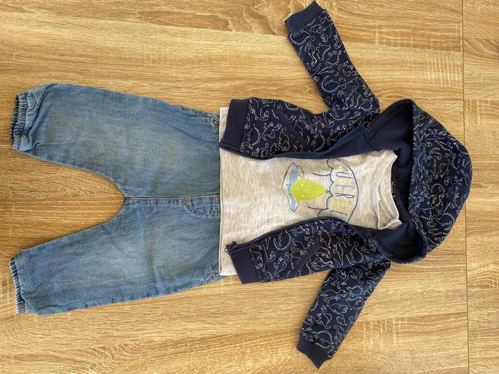 Ensemble 3 pièces, un pantalon jean de marque h&m et de taille 74 cm, un t-shirt manches longues de marque tex et de taille 12 mois et une veste imprimé dinosaure de marque inextenso et de taille 74 cm.