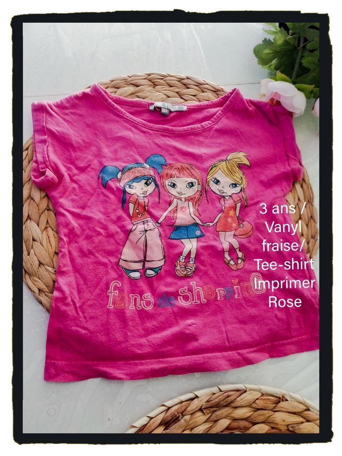 3 ans vynil fraise Tee-shirt imprimé rose /bon état - photo numéro 1