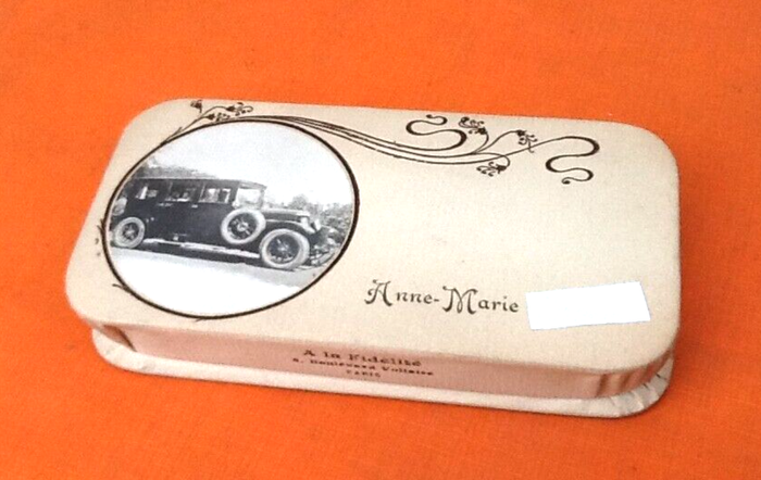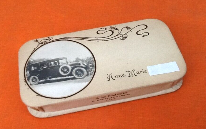 Années 1930 Boite à dragées Boite rectangulaire cartonnée Anne-Marie D, décor imposante automobile Fiat 525 A la fidélité 4 Boulevard Voltaire Paris Longueur : 145mm Largeur : 75mm Hauteur : 25mm Poids : 40grs