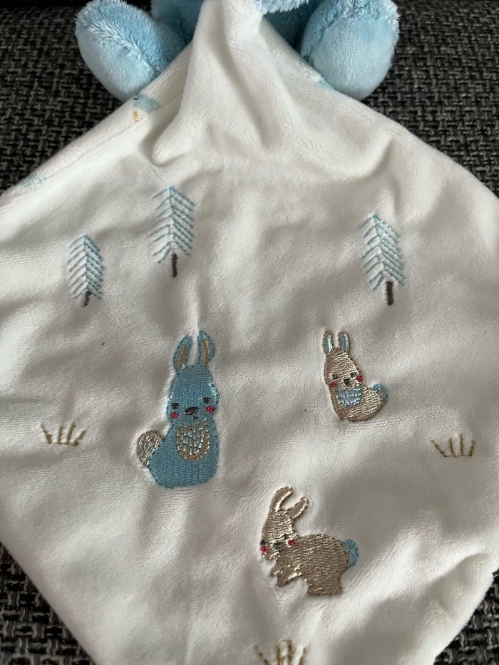 Doudou lapin Tex Carrefour Bleu et blanc Petits lapins Sapins #jessicaeden78doudous