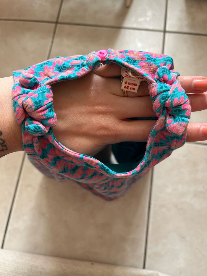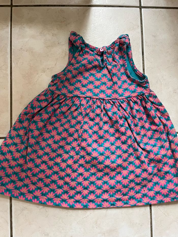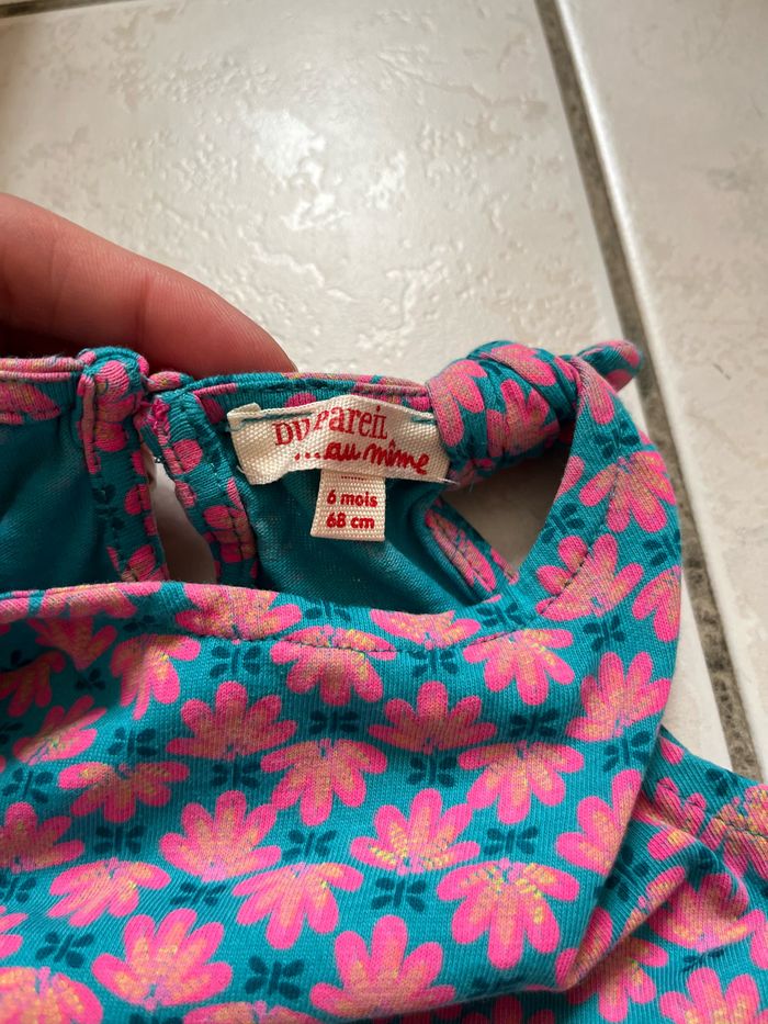 Robe bleu avec fleurs rose en taille 6 mois, en très bon état. Elle a des noeuds au niveau des bretelles. Elle vient de la marque Du pareil au même (DPAM)