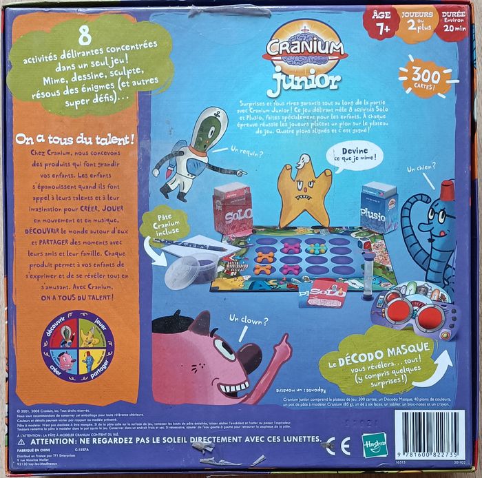 Jeu de société où le but du jeu est de gagner en sculptant, décrivant, mimant, et en dessinant ! Principe du jeu : Une fois les équipes constituées, déplacez-vous sur le plateau et jouez l'action de la carte avant la fin du sablier ! L'équipe remporte la partie lorsque vous êtes au centre du Cranium ! 5€
