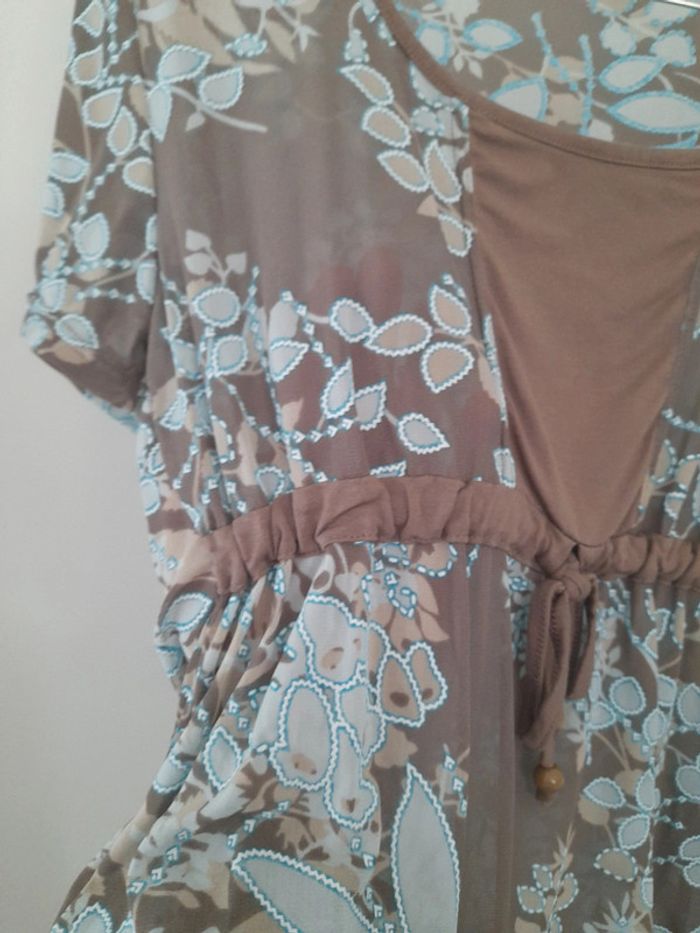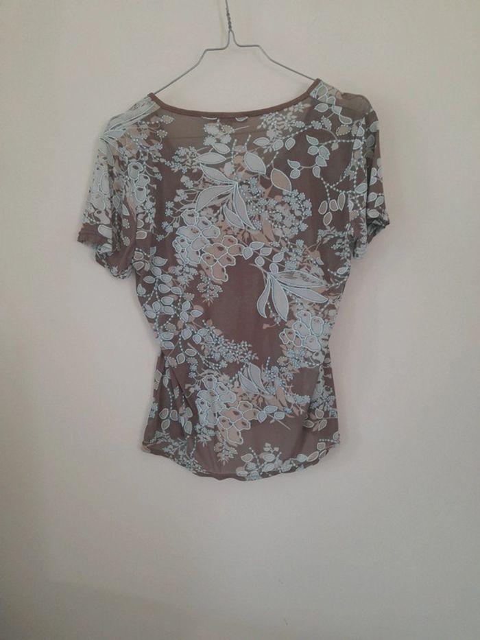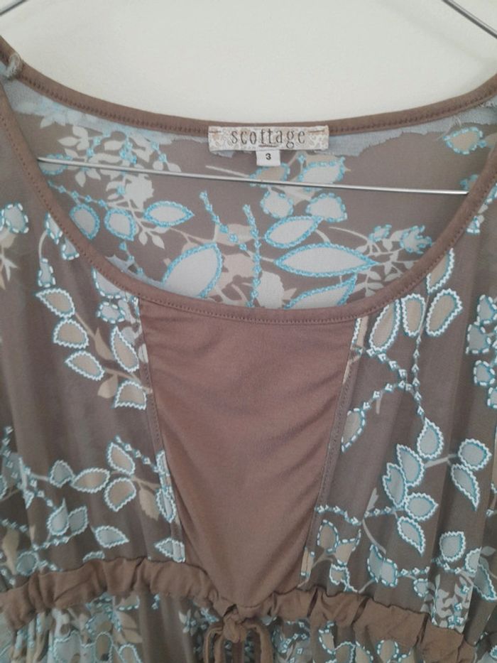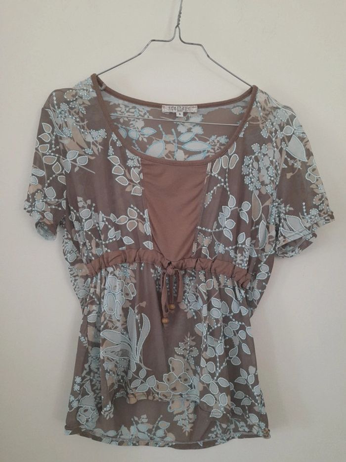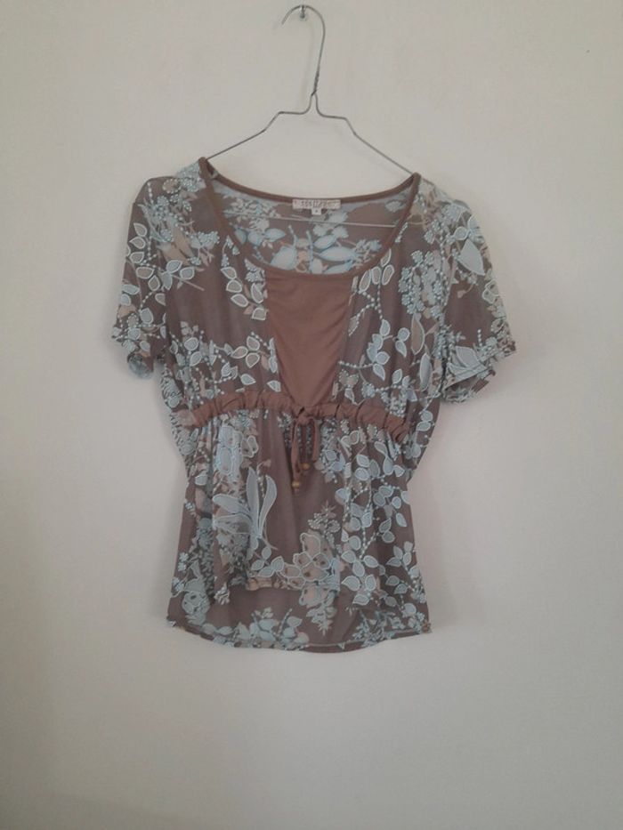 Top transparent. Couleurs bleu et marron. Marque scottage. Taille 3 soit 40 Epaule a epaule 43cm Aisselle à aisselle 43cm Longueur 55cm #vetementtaille40louisy37310
