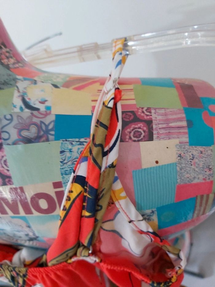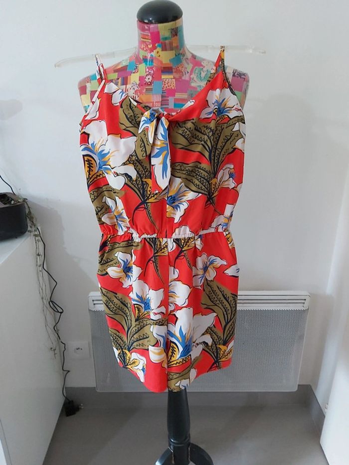 Combishort rouge, à bretelles réglables, un nœud, 2 poches, motif floral.