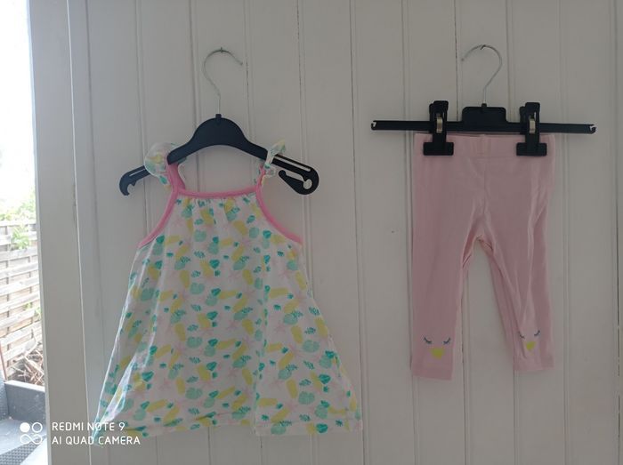 Ensemble 2 pièces taille 6 mois comprenant un Haut bretelles blanc avec des dessins jaune et vert et un pantalon legging rose. #solangelstaille6mois