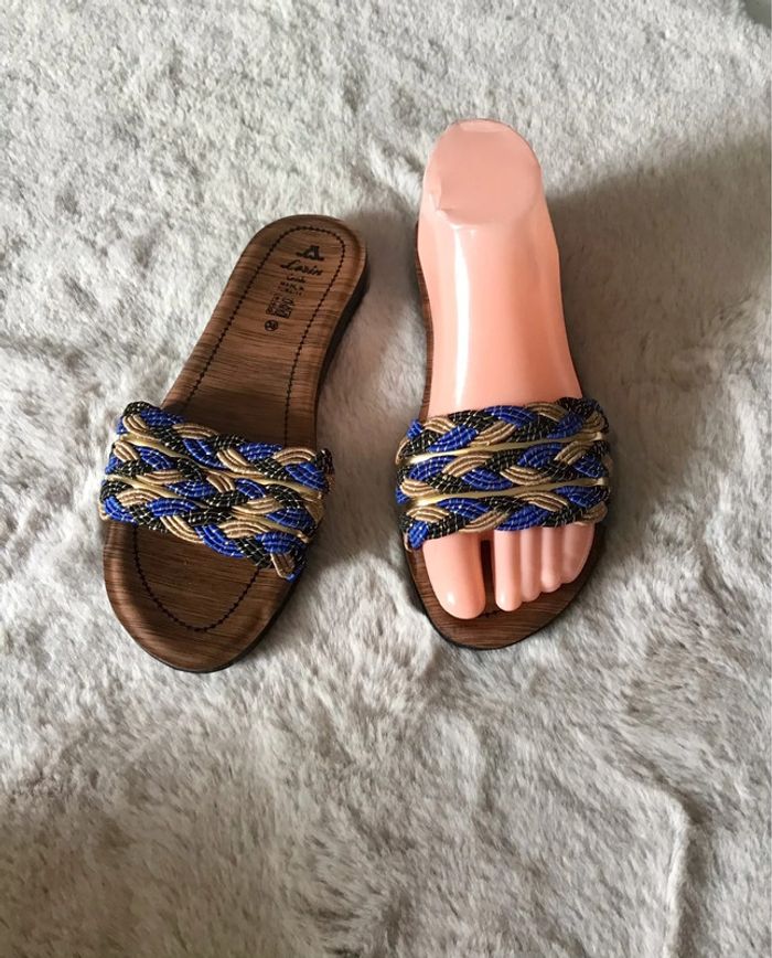 🌸 Paire de sandales bleu noir beige et dorée 🌸 Taille 38 🌸 Non Servis 🌸 De Marque Lorine ⚠️⚠️ SI VOUS DÉSIREZ FAIRE UN LOT 📦 🌸N’hésitez pas à me le demander je ferait une annonce globale de vos articles pour faire un seul FDP🌸🌸 ➡️ N’HÉSITEZ PAS À M’AJOUTER DANS VOS FAVORIS 06/23
