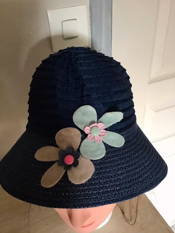 🌸 très beau chapeau de coloris bleu marine de taille 2-3 ans 51/52 environ avec fleur bleue ciel est gris sur le devant, élastique de maintien Non Servis ⚠️⚠️ SI VOUS DÉSIREZ FAIRE UN LOT 📦 🌸N’hésitez pas à me le demander je ferait une annonce globale de vos articles pour faire un seul FDP🌸🌸🌸 ➡️ N’HÉSITEZ PAS À M’AJOUTER DANS VOS FAVORIS