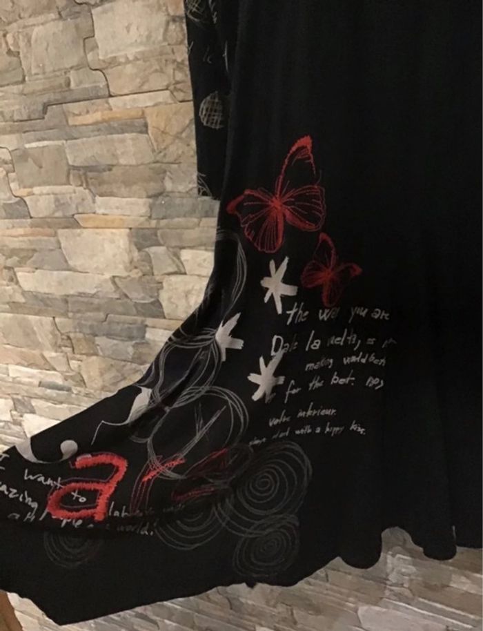 🌸 Très jolie robe DESIGUAL manches longues avec décolleté En V , de coloris noir et rouge, le bas de la robe est asymétrique sur un côté, taille M,TBE 🌸 Long de 95 cm, motifs sur le bas de la robe les bras le haut de la poitrine et aussi dans le dos ⚠️⚠️ SI VOUS DÉSIREZ FAIRE UN LOT 📦 🌸N’hésitez pas à me le demander je ferait une annonce globale de vos articles pour faire un seul FDP🌸🌸🌸 ➡️ N’HÉSITEZ PAS À M’AJOUTER DANS VOS FAVORIS