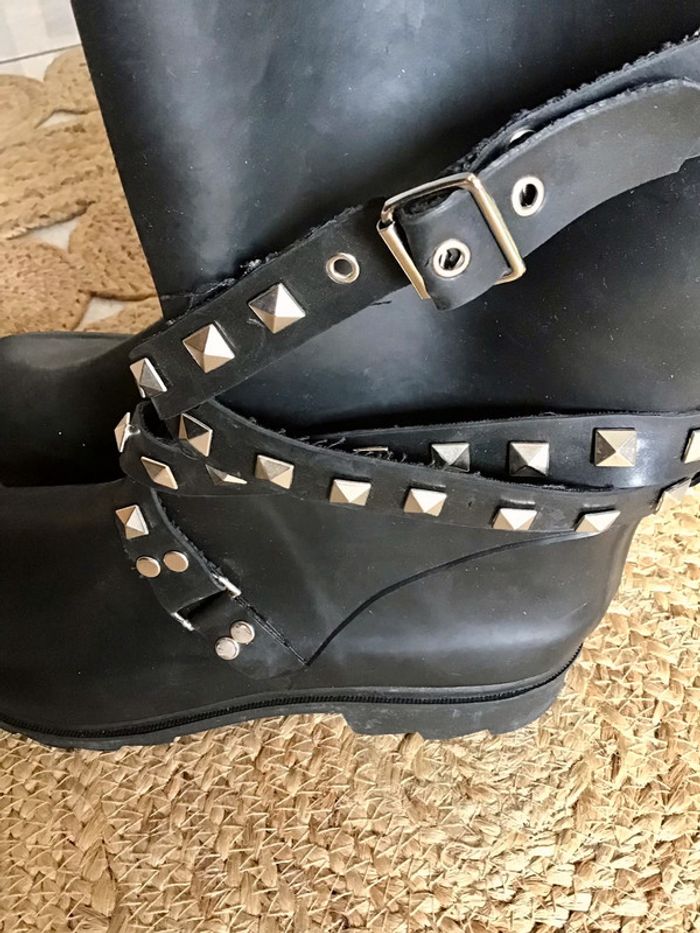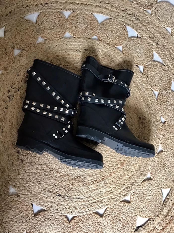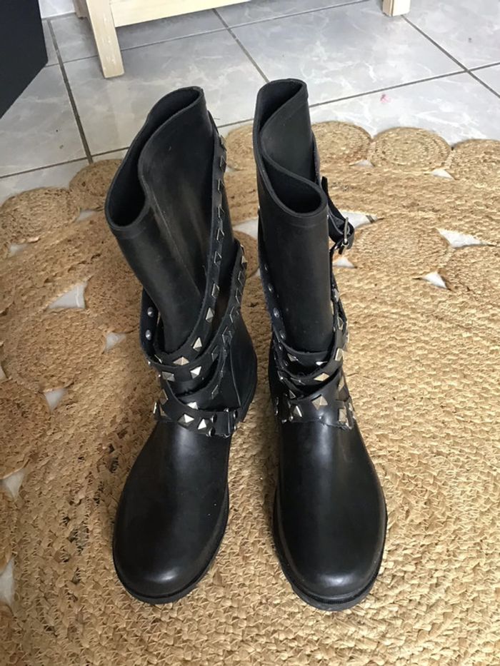 🌸 Paire de bottes en caoutchouc de pluie de coloris noir avec lanières réglable sur tout le tour de la botte de coloris noir et argenté en taille 39 Non Servis 🌸 Mixte haute de 28 cm environ ⚠️⚠️ SI VOUS DÉSIREZ FAIRE UN LOT 📦 🌸N’hésitez pas à me le demander je ferait une annonce globale de vos articles pour faire un seul FDP🌸🌸🌸 ➡️ N’HÉSITEZ PAS À M’AJOUTER DANS VOS FAVORIS