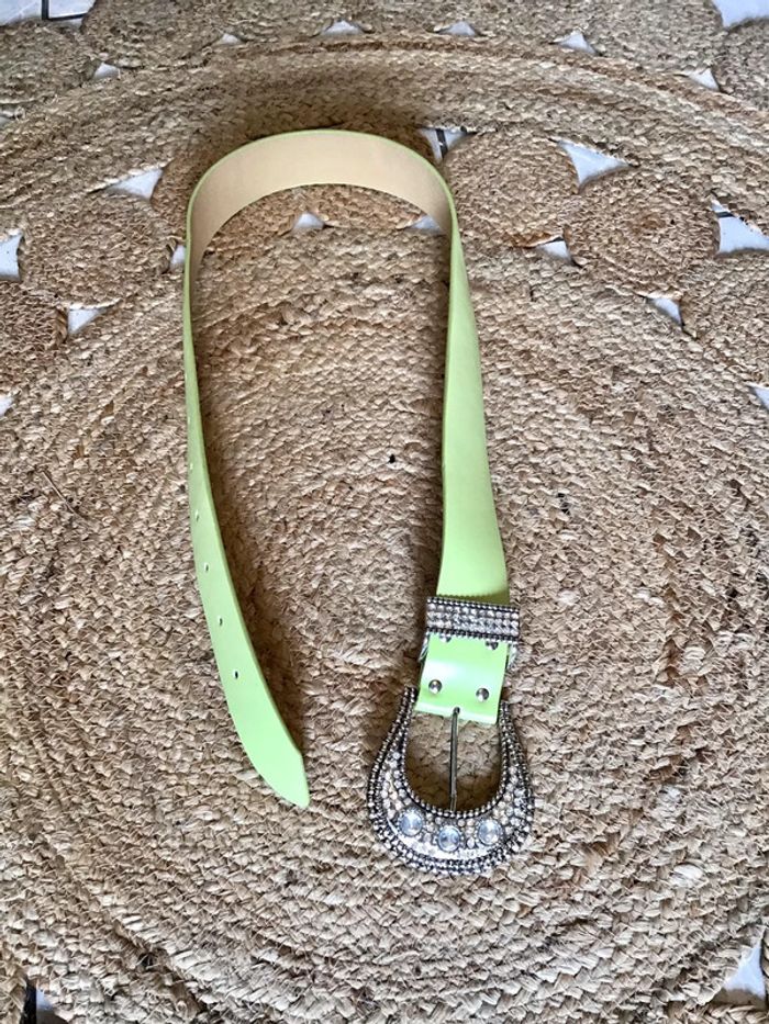 🌸 très jolie ceinture de coloris anis avec boucles argenté et strass de taille unique soit environ 75 à 95 , large de 4,8 cm Non Servis ⚠️⚠️ SI VOUS DÉSIREZ FAIRE UN LOT 📦 , 🌸N’hésitez pas à me le demander je ferait une annonce global de vos articles pour faire un seul FDP🌸🌸🌸 ➡️ N’HÉSITEZ PAS À M’AJOUTER DANS VOS FAVORIS