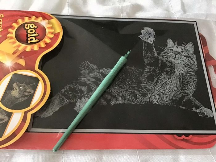 🌸 Kit créatif Scratch Art couleur dorée modèle chat avec 1 stylet de grattage Non Servis 🌸 gratter les lignes du contour blanche à l’aide du stylet pour faire apparaître le chat doré, nettoyer l’image avec un chiffon, image de 20 X 15 cm ⚠️⚠️ SI VOUS DÉSIREZ FAIRE UN LOT 📦 🌸N’hésitez pas à me le demander je ferait une annonce global de vos articles pour faire un seul FDP🌸🌸🌸 ➡️ N’HÉSITEZ PAS À M’AJOUTER DANS VOS FAVORIS