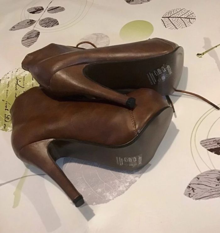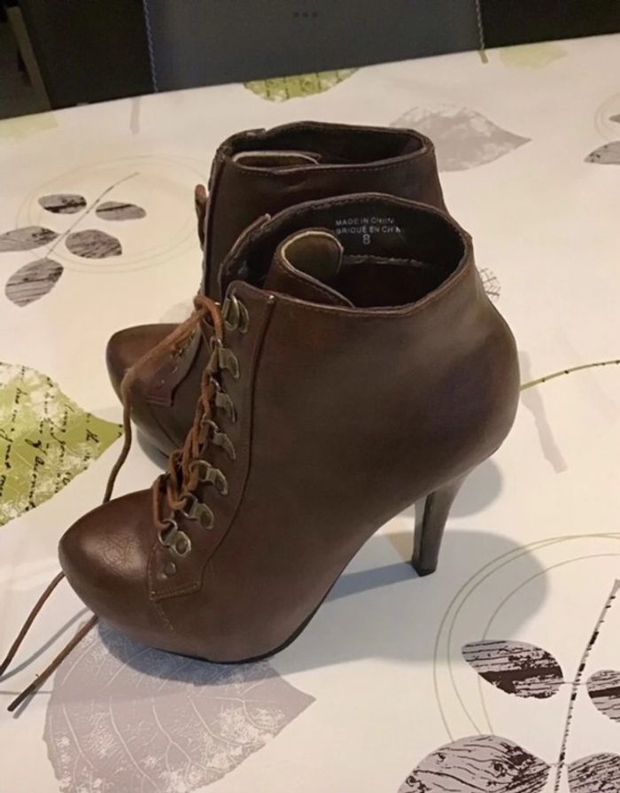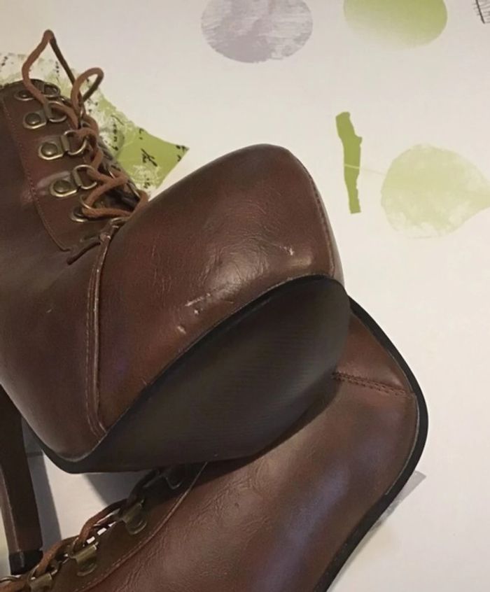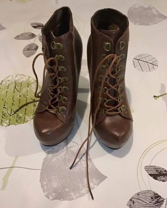 🌸 Bottine à lacet taille 38 haut talon et plateforme sur le devant Non Servis 🌸 Talon de 13 cm et plateforme devant de 4 cm 🌸 Une petite griffe sur le côté devant mais vraiment pas méchant , non mise d’où le petit prix ⚠️⚠️ SI VOUS DÉSIREZ FAIRE UN LOT 📦 , 🌸N’hésitez pas à me le demander je ferait une annonce global de vos articles pour faire un seul FDP🌸🌸🌸 ➡️ N’HÉSITEZ PAS À M’AJOUTER DANS VOS FAVORIS