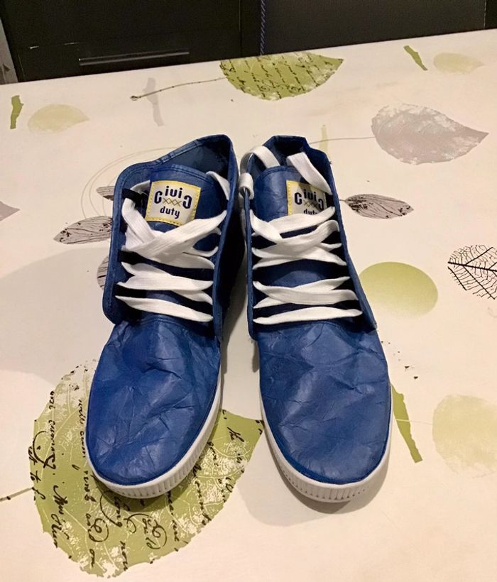 🌸 Baskets montante en papier imperméable marque Civic Duty de taille 42 bleu et blancheNon Servis 🌸 Les baskets imperméable bio en papier de marque CIVIC DUTY , 🌸 Elles Sont réalisés en Tyvex matière respirante et confortable, imperméable et résistante, Une marque éco respectueuse, 🌸 Une matière imperméable est préalablement froisser pour donner aux chaussures à look vintage 🌸 Avec semelles sont ultra souples et solide ⚠️⚠️ SI VOUS DÉSIREZ FAIRE UN LOT 📦 , 🌸N’hésitez pas à me le demander je ferait une annonce global de vos articles pour faire un seul FDP🌸🌸🌸 ➡️ N’HÉSITEZ PAS À M’AJOUTER DANS VOS FAVORIS