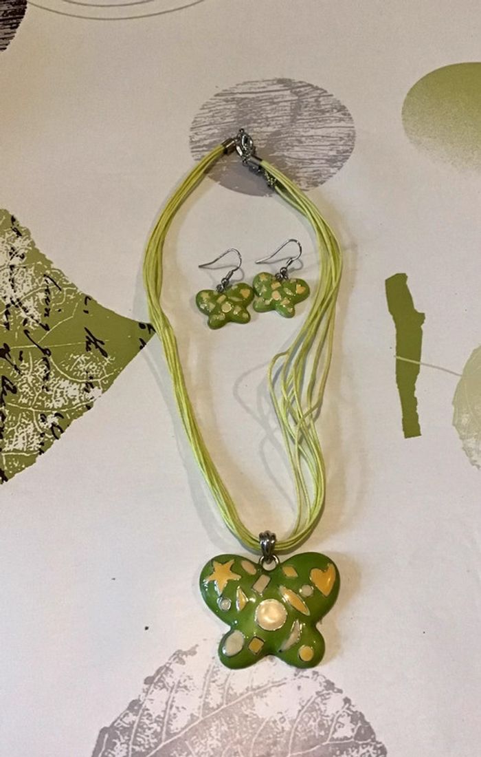 Ensemble parure bijoux collier et boucle d’oreille assorties ds  tons vert