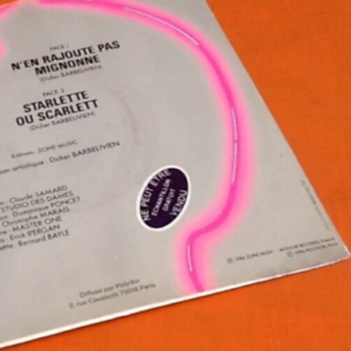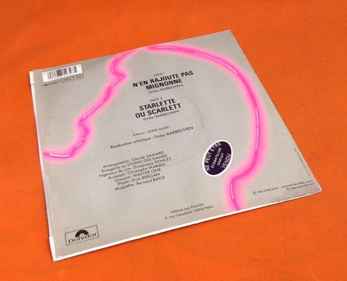 Vinyle 45 tours Dick Rivers N' en rajoute pas mignonne (1986) Polydor 885432 7 Disque promotionnel (réservé à la presse, Dj...) A N' en rajoute pas mignonne 3:16 B Starlette ou Scarlett 4:00
