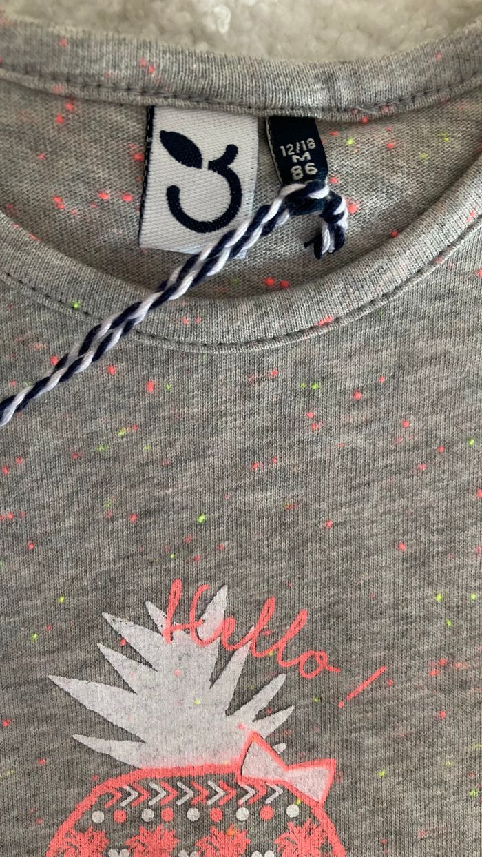 Beau tee-shirt neuf 3 Pommes Gris Rose Ananas 12-18mois - photo numéro 2