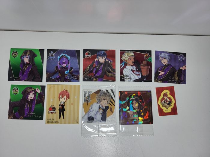 Merci de ne pas acheter l'annonce. Contactez moi par message afin que je puisse vous faire une annonce. stickers : Silver 21, Ortho Shroud 18, Deuce Spade 3, Kalim Al-Asim 12, Azul Ashengrotto 9, Lilia Vanrouge 20, Sticker / Card Riddle Rosehearts x2, Sticker / Card Leona Kingscholar, Sticker / Card Ruggie Bucchi prix a l'unité : 1 euros. Lot en bon état.