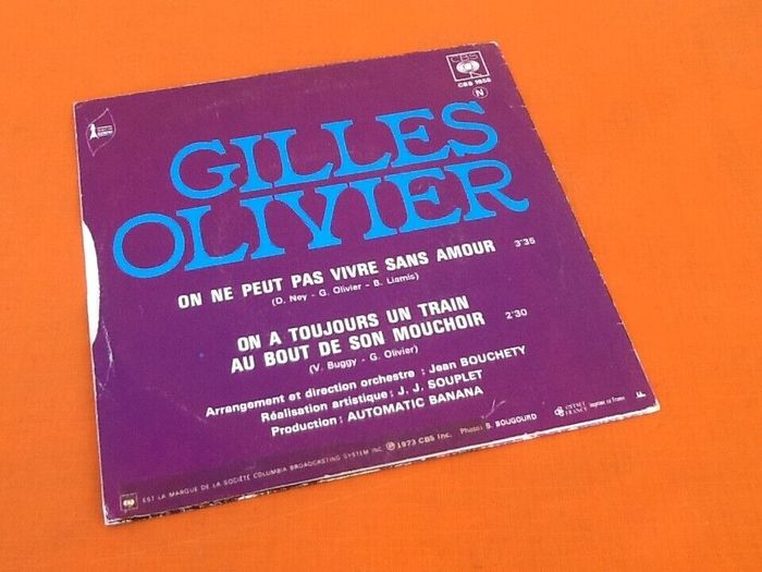 Vinyle 45 tours Gilles Olivier On ne peut pas vivre sans amour (1973) CBS 1856 A On Ne Peut Pas Vivre Sans Amour Written-By – B. Liamis*, D. Ney*, G. Olivier* 3:35 B On A Toujours Un Train Au Bout de Son Mouchoir Written-By – G. Olivier*, V. Buggy* 2:30