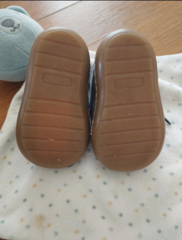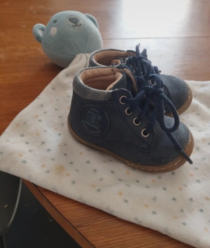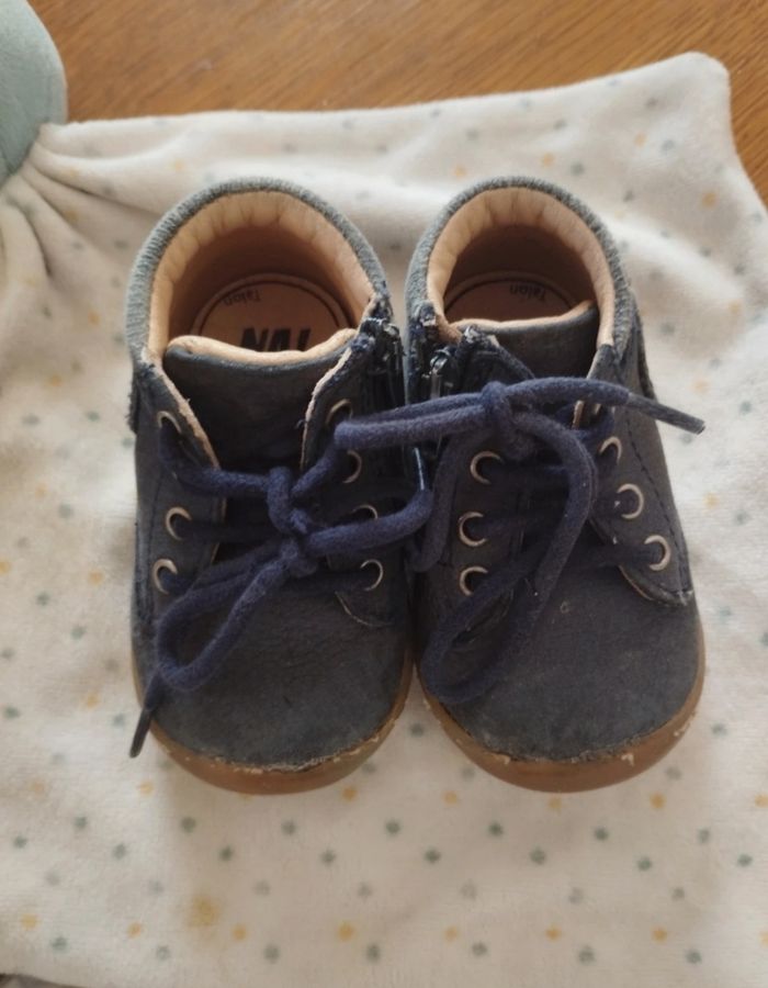 Chaussures premiers pas Taille 18 Dessus doublure et semelle intérieure cuir Achetées au mois il y a quelques mois 40 euros Devant un peu abîmé et usé cf photo mais pourra largement servir a un autre petit garçon pour ses premiers pas