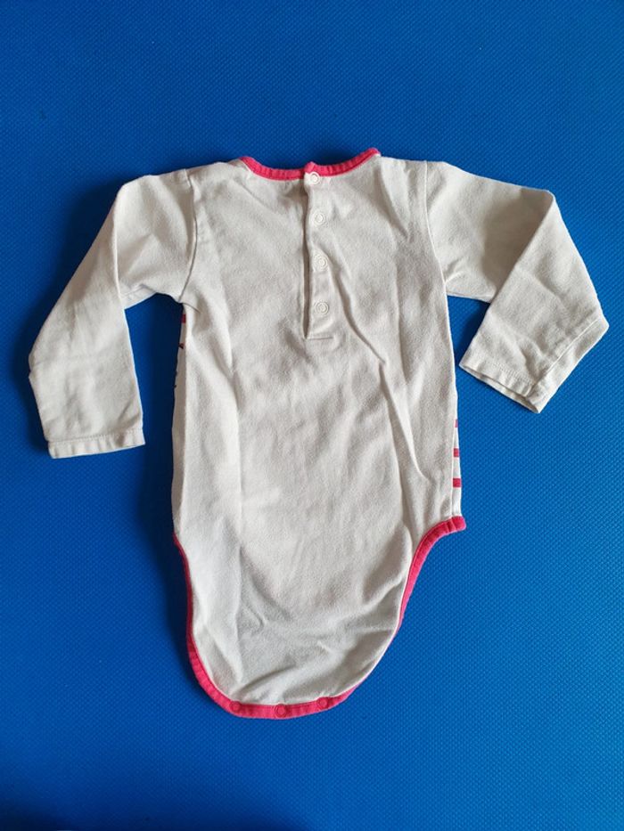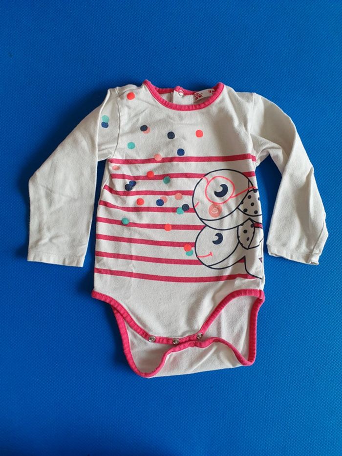 Très joli bodi manches longues 18 mois. Il a été bien porté mais pas de trou ou grosse tâche à noter. Confettis, poissons, marinière rose