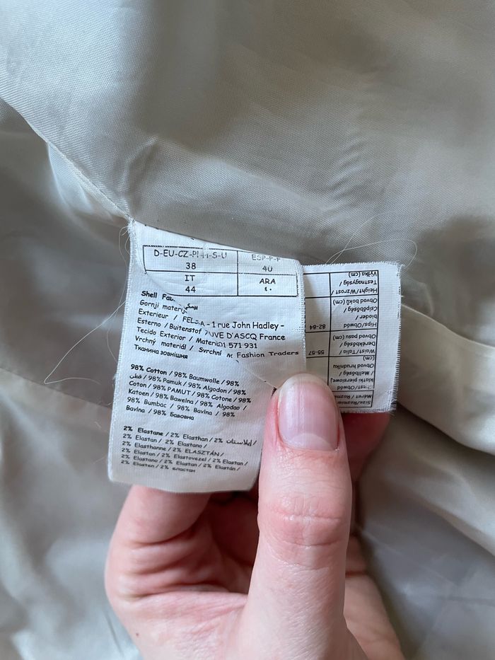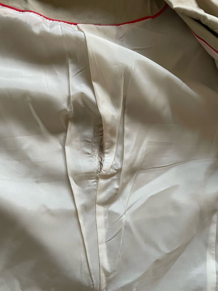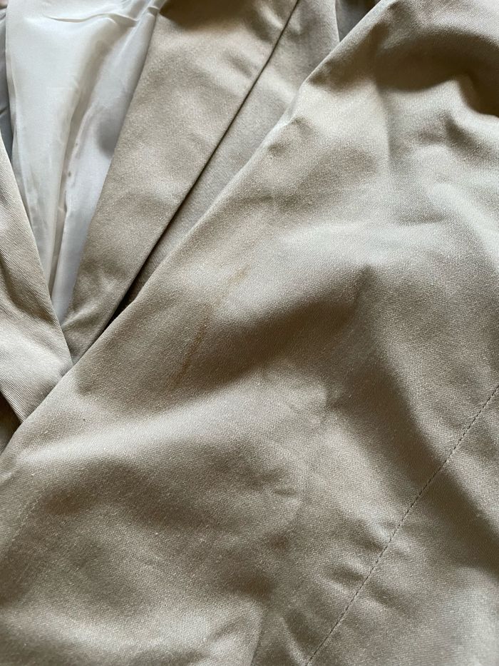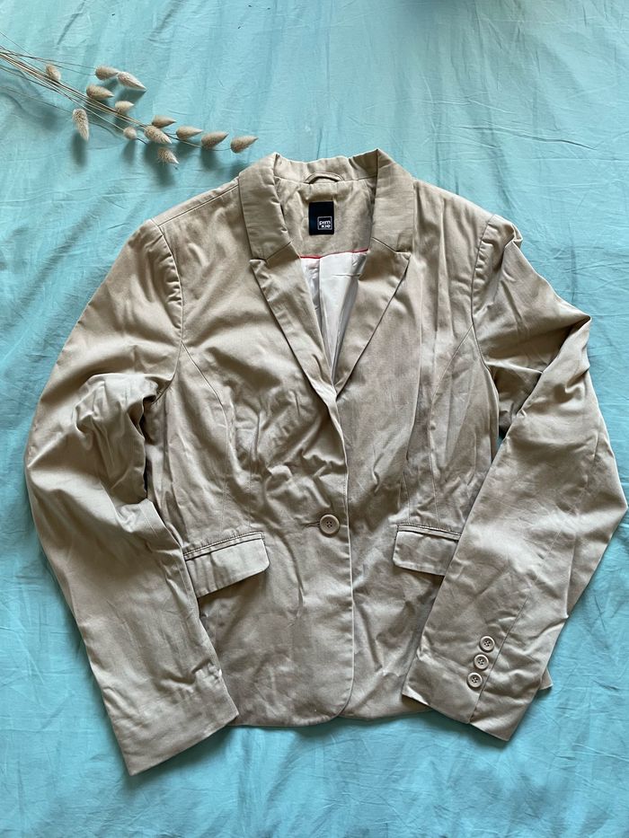 💬 Blazer de couleur beige. État satisfaisant (couture de la doublure intérieure abîmée et tachée sur la manche gauche, visibles sur photos). 🛍️ Marque Pimkie 📏 Taille 38 🧺 Lavé puis stocké dans une armoire en attendant son nouveau propriétaire.