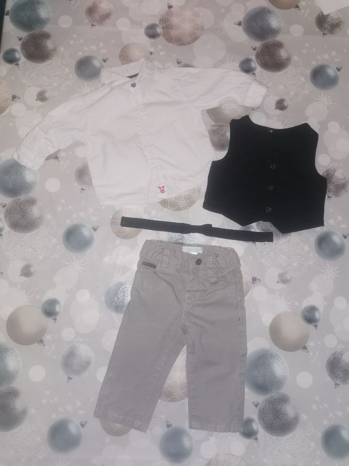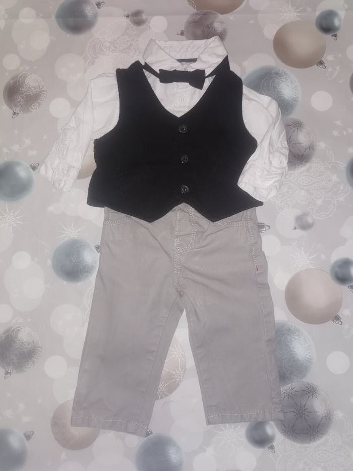 Ensemble 4 pièces (chemise blanche, nœud papillon à scratch noir, gilet noir et pantalon gris) taille 3M (59cm) de la marque Obaïbi très bon état.