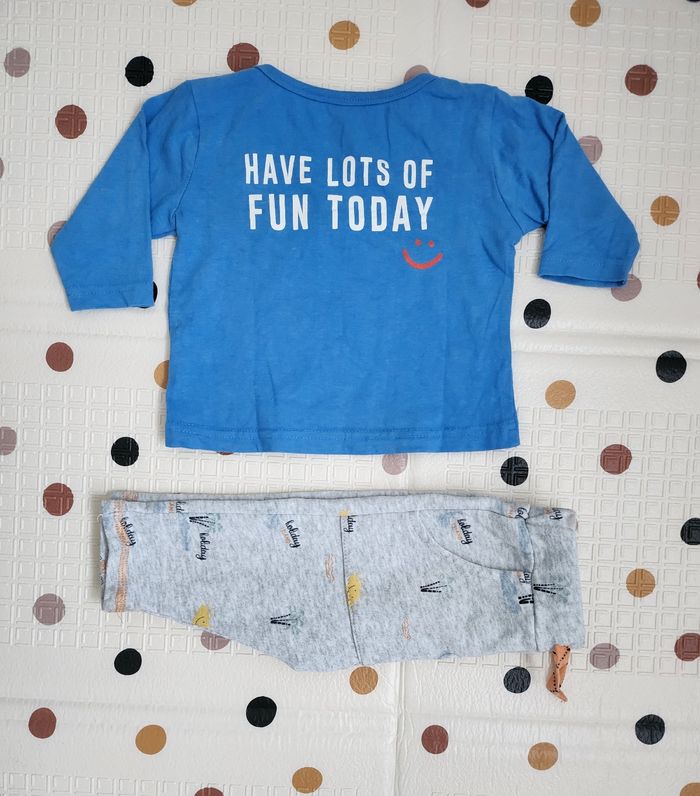Très bel ensemble avec de jolies couleur. 1 T-shirt ML bleu Zeeman 1 Jogging imprimé Kiabi En très bon état ! Taille 6 mois.