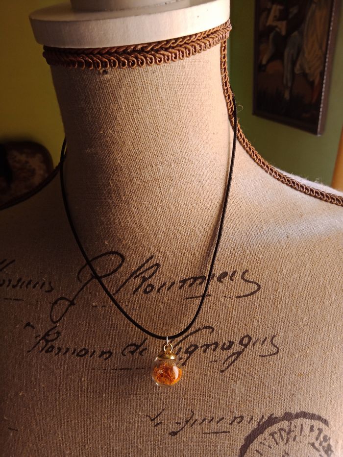 Collier fantaisie neuf en cuir avec boule en verre transparent avec paillettes à l'intérieur.