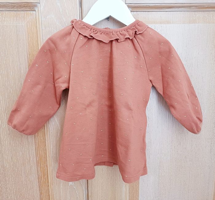 Jolie robe manches longues coton Verbaudet 18m (81 cm) marron avec motifs dorés. Volant au col, pressions invisibles dos, lavage 30°.