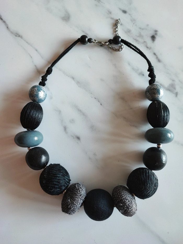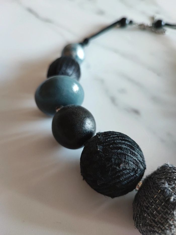 Collier coloris gris bleu noir, boules en bois et laine. #ledressdejena_bijoux