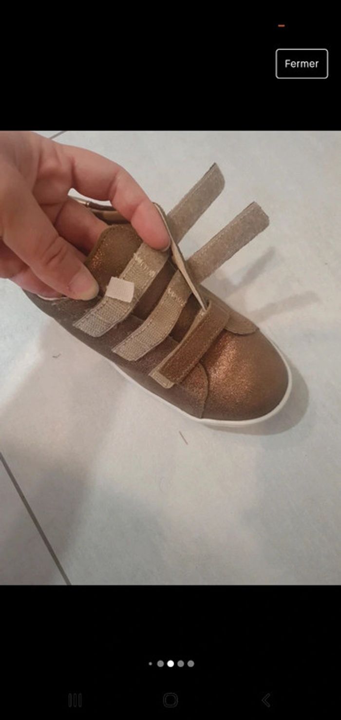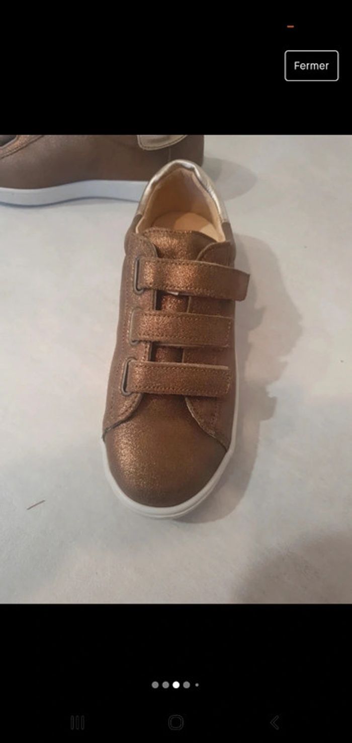Jolie paire de baskets bronze légèrement pailleté taille 34 (taille correctement) Malheureusement ma fille a fait une poussée et est passée du 33 au 35 donc avec regrets, nous nous séparons de cette jolie paire Un petit scratch permet d'ajuster la languette du haut et de gérer la largeur. Vendues dans la boîte d'origine. Prix d'achat : 95€