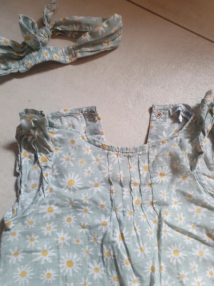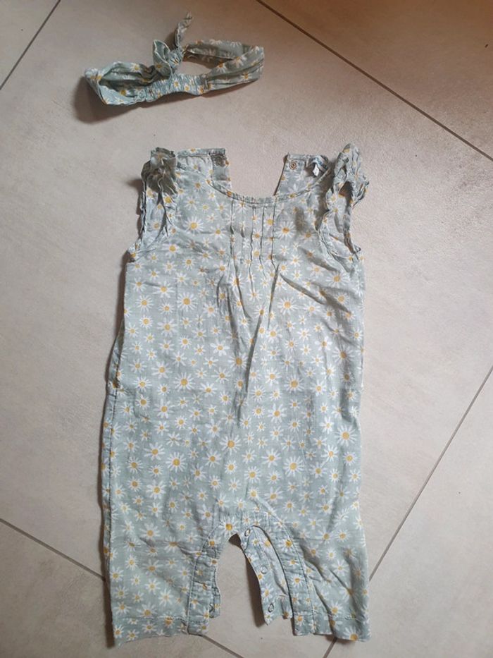 Jolie combinaison florale Vertbaudet 6 mois Pression sur l'entrejambe pour le changement de couches, et dans le dos pour la fermeture. Petit bandeau assorti pour un petit look à tomber ! Excellent état, peu porté