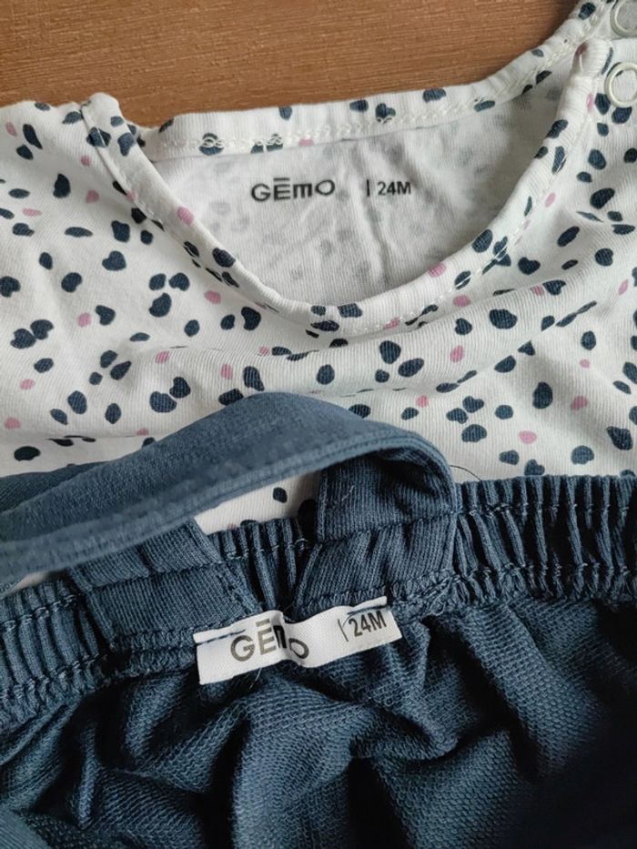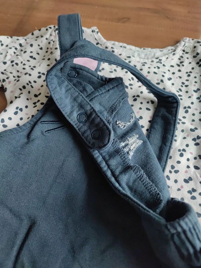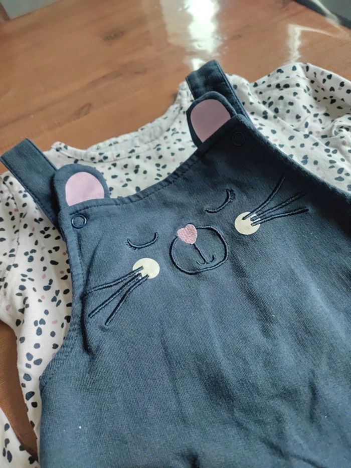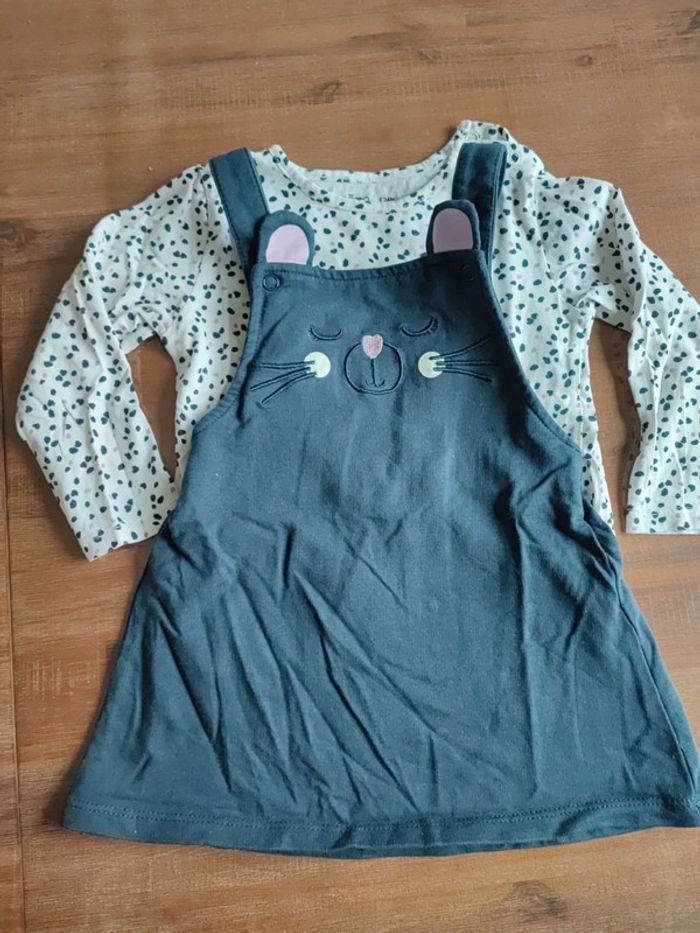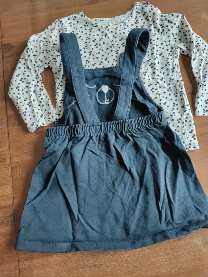 Joli ensemble Haut manches longues blanc avec poid bleu marine et lilas+ jupe bleu marine coton avec bretelles (réglables en longueur avec 2 pressions), motif tête chat devant Jolie portée (je croisais les bretelles derrière pour faire joli dans le dos ☺️) Marque Gémo Taille 24 mois Très bon état, peu portée Envoi rapide #cyboulette44fille24mois