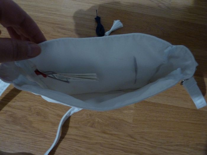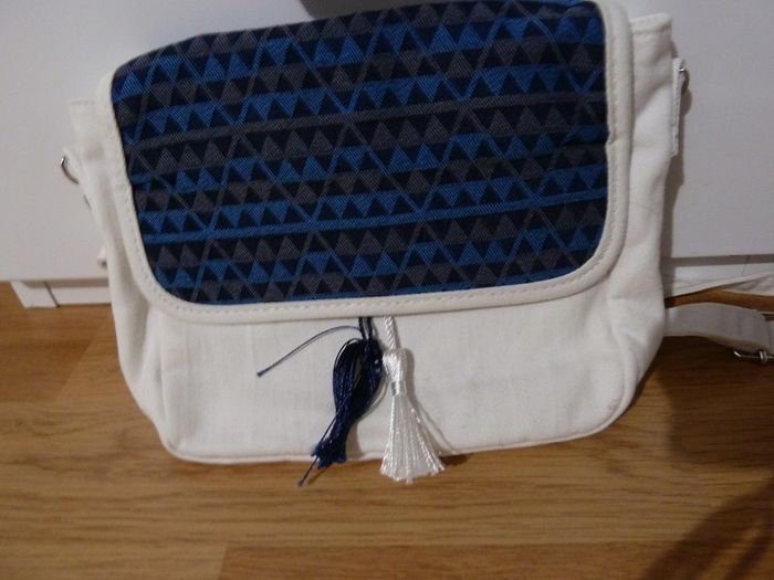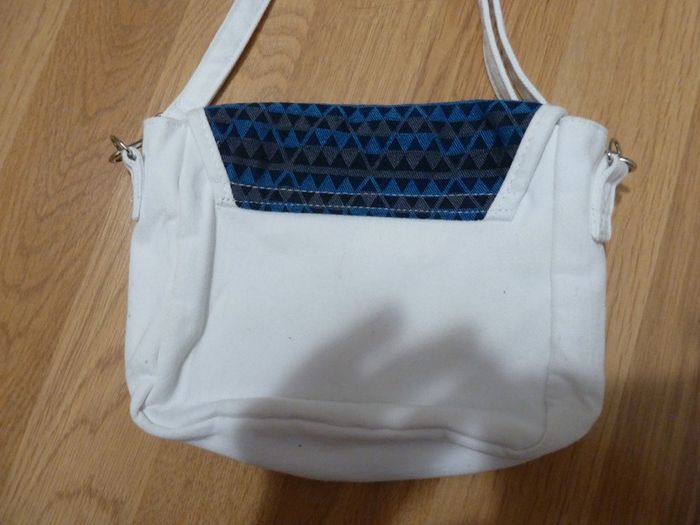 Sac à main blanc et bleu en tissu - Marque Orchestra Fermeture par 1 pression sur le devant Bandoulière blanche réglable (possibilité de la retirer) A l'intérieur 1 poche